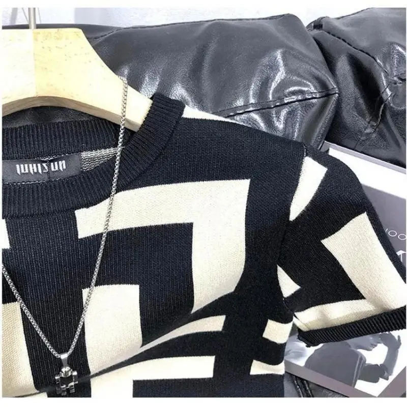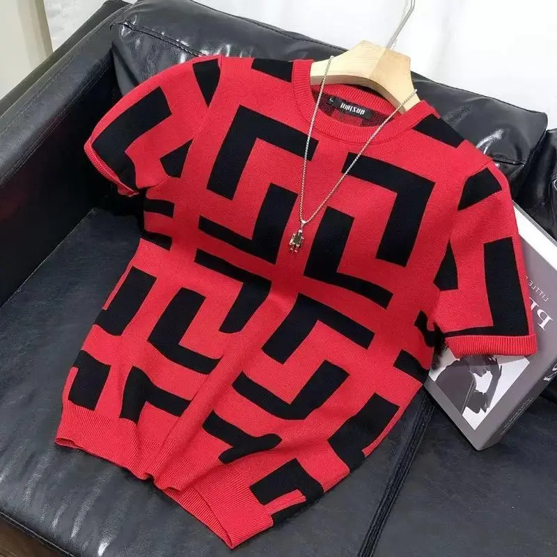 (New)Spring and Autumn Men's Slim Fit Geometric Bottom T-shirt Casual Fashion Short Sleeve Knitted Top Summer Men's T-shirt