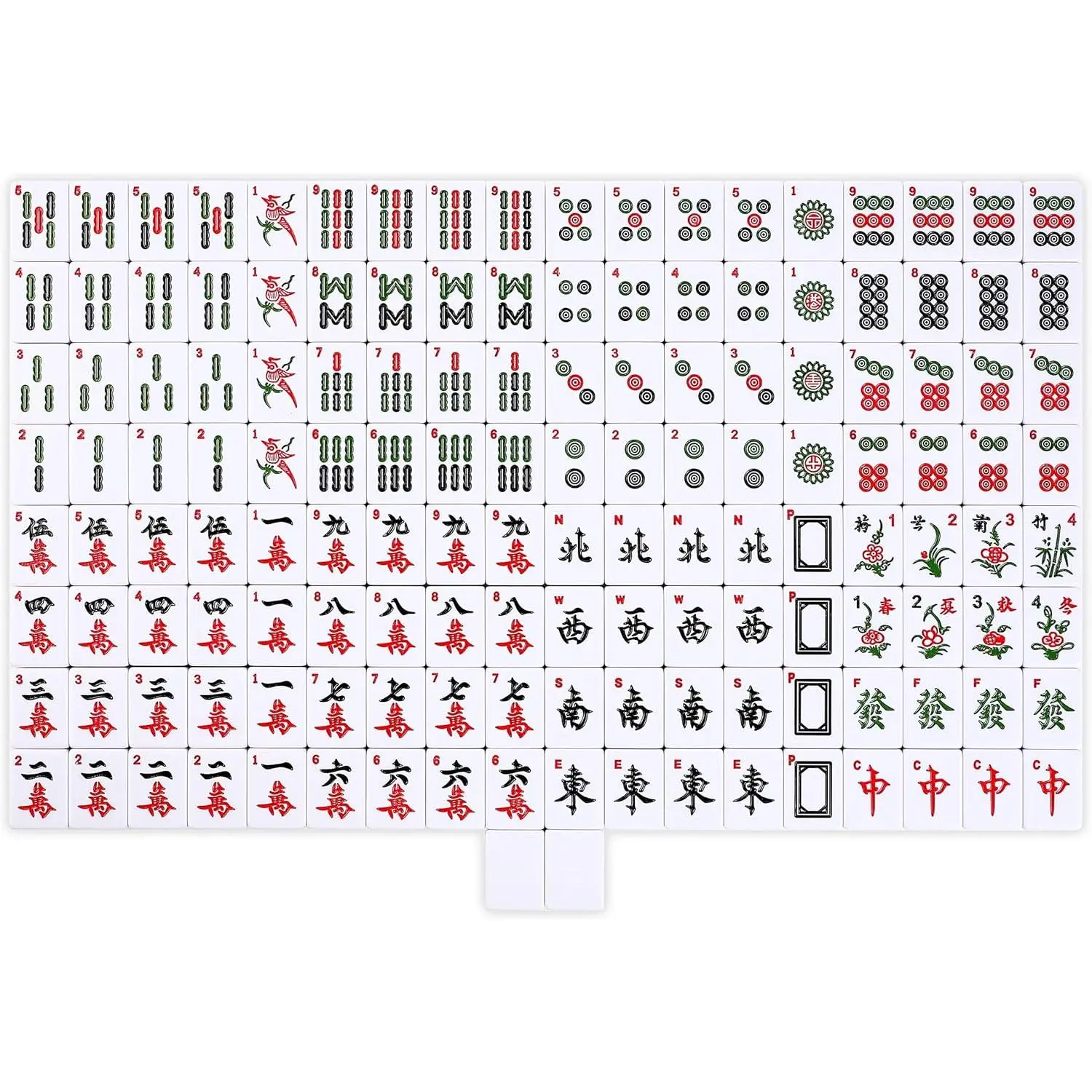 The completed set includes 144 tiles, 2 spare tiles, 3 dice, a bettor/wind indicator, a set of colored chips.(ENGLISH INSTRUCTION ALSO INCLUDED)