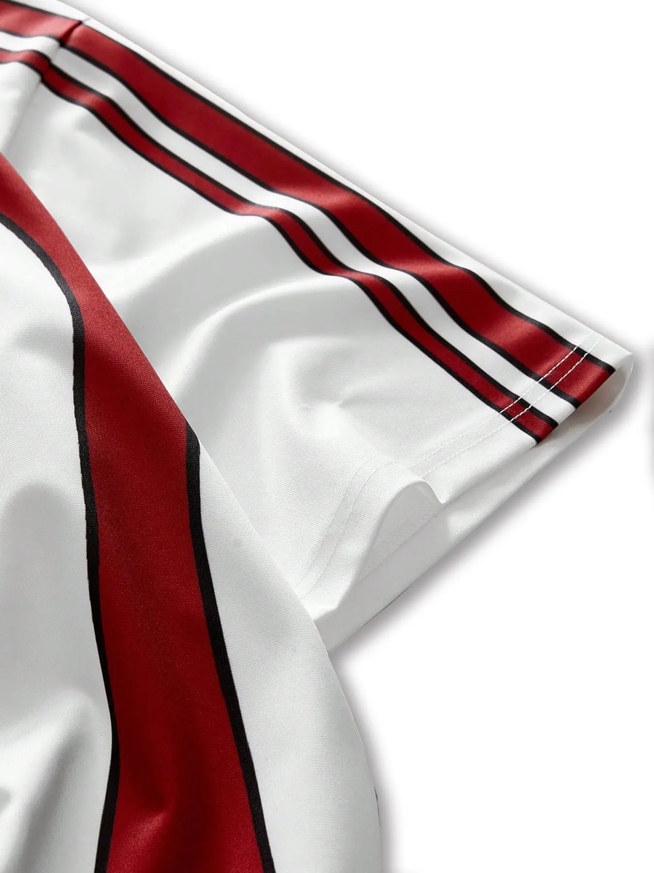 【Retro Aesthetic】: Embrace the 90s vibe with this white red striped soccer jersey, perfect for vintage enthusiasts.