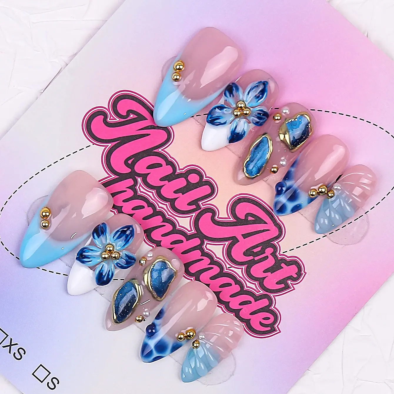 4. Delicatething Y2K Style Almond Shape Handmade Nail Art, 4 Sizes XS-S-M-L, Blue Ombre, Hand Carved, French Design, Perfect for Parties, Includes Jelly Glue, Crystal Stick, File