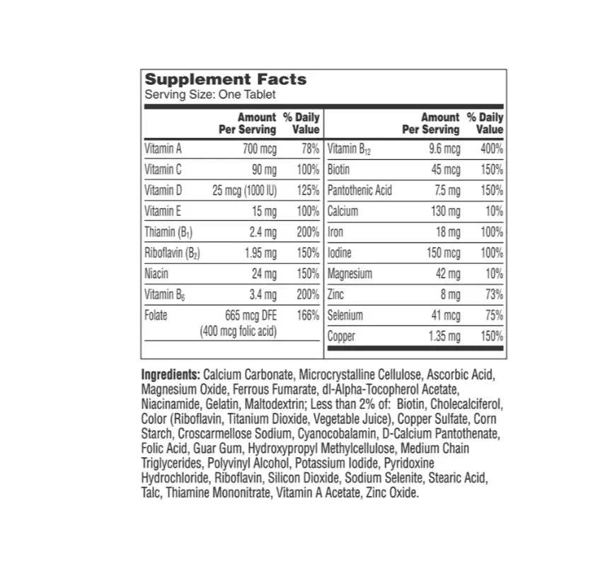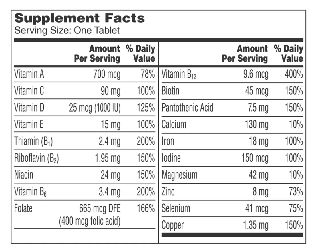 Vitamin A,Vitamin D,Thiamin (B1),Riboflavin (B2),Niacin,Vitamin B6,Folate,Vitamin B12,Biotin,Pantothenic Acid,Calcium,Iron,Iodine,Magnesium,Zinc,Selenium,Copper.,Vitamin C,Vitamin E