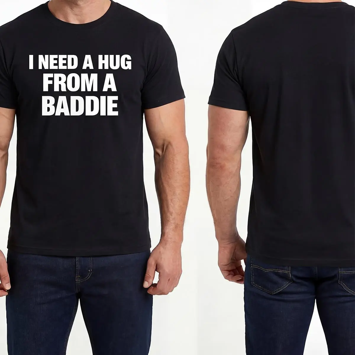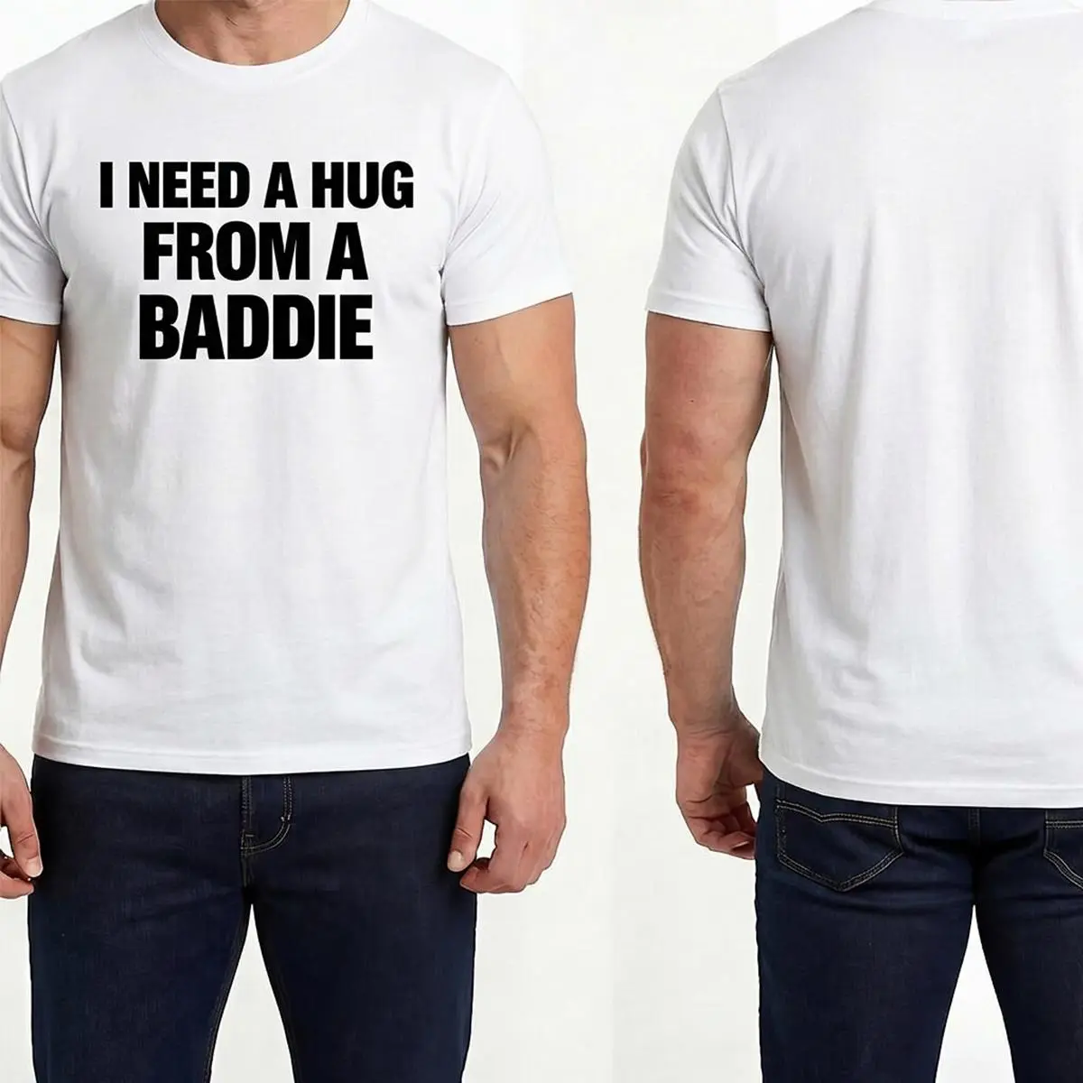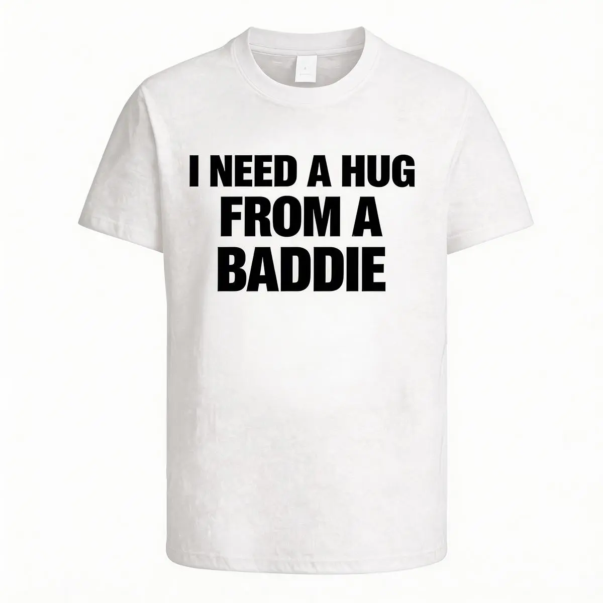 This Men's Summer Cotton T-Shirt features the playful text "I NEED A HUG FROM A BADDIE." It's a fun, graphic design that stands out. The shirt is made from 100% cotton, ensuring comfort and breathability. Ideal for casual outings, it offers a classic fit that's both stylish and relaxed. Pair it with jeans for a laid-back look.