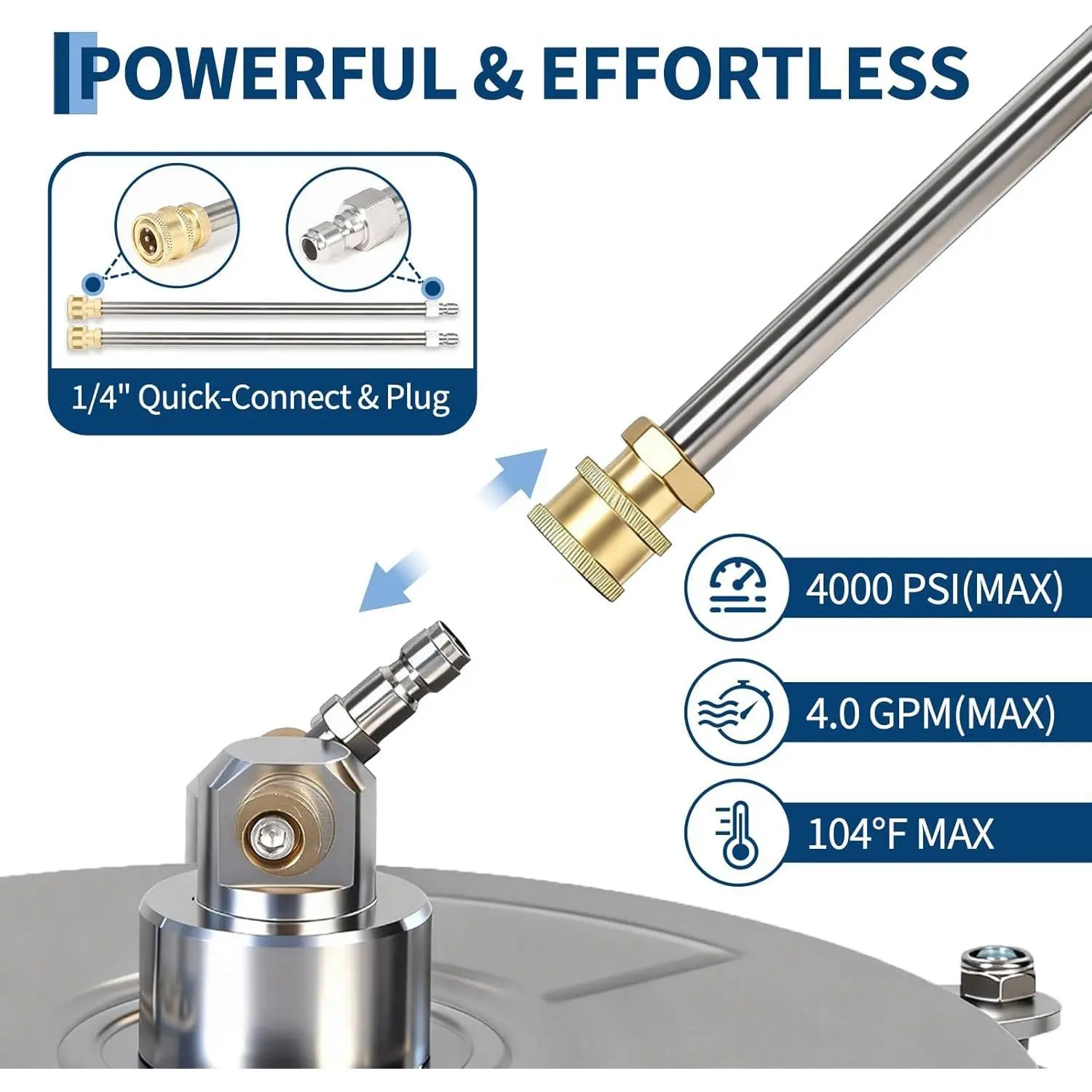 ·UNIVERSAL COMPATIBILITY: Works with most gas and electric pressure washers rated 3,000–4,000 PSI. Standard 1/4" quick-connect plug installs in seconds. Built-in inlet filter helps prevent clogs and protects internal components.