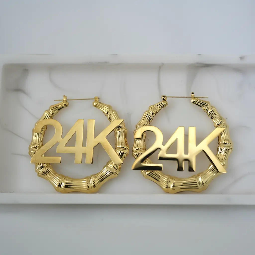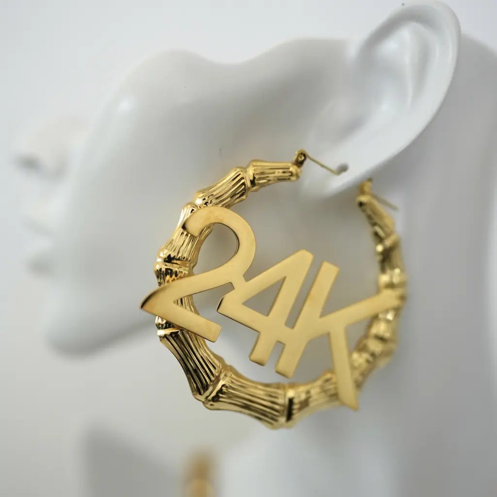 Oversized bamboo-textured hoops feature our iconic "24K" script worked directly into the hoop design — instantly recognizable, impossibly bold, and built to be seen from every seat in the house.