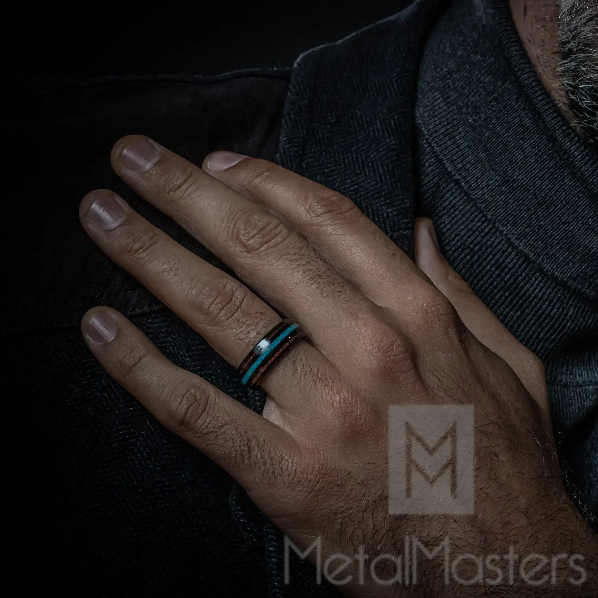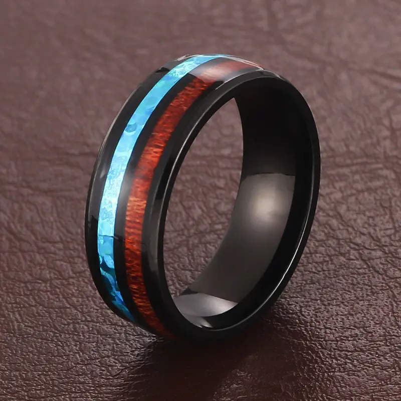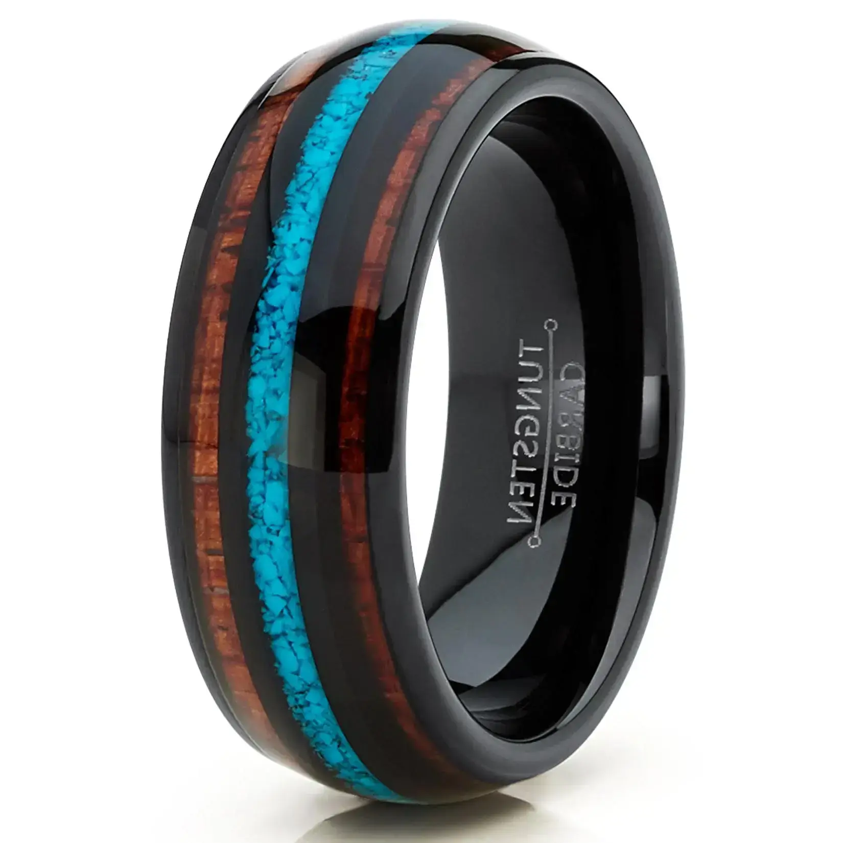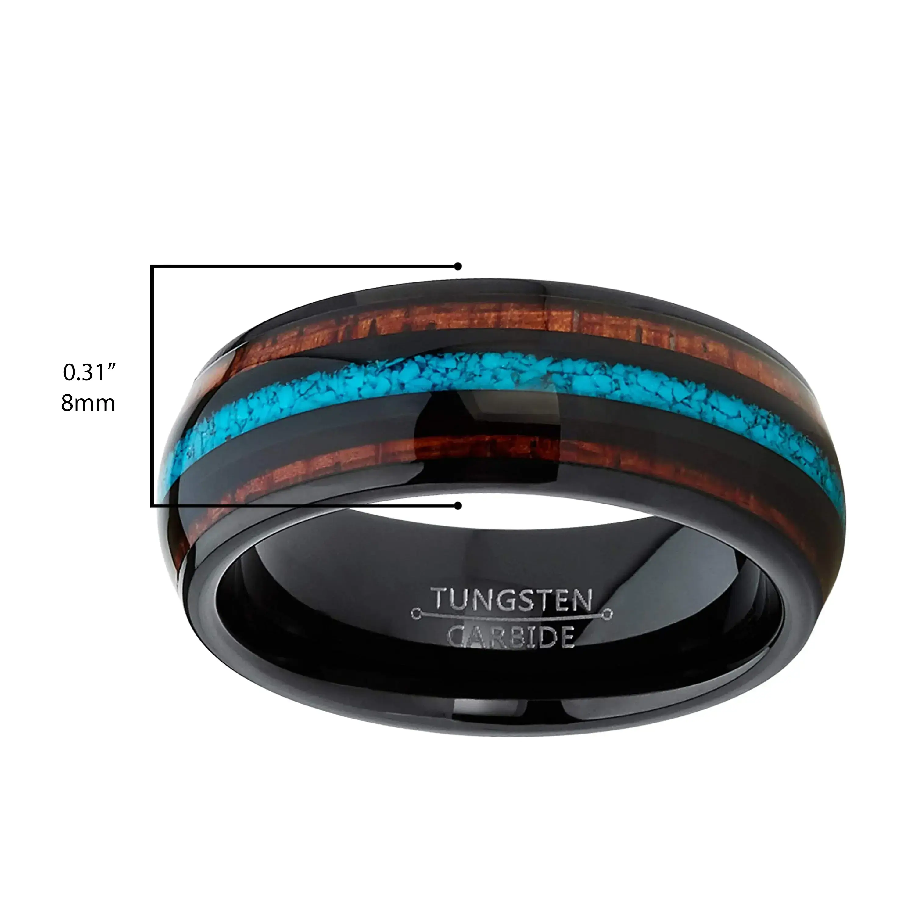 Modern and unique, this handsome ring has been expertly crafted from black tungsten to add bold style to your look. The band features a high polish shine on the slightly domed design with three inlaid stripes alternating with the black tungsten. The center stripe is inlaid with crushed turquoise and the two outer stripes have genuine Hawaiian Koa wood, topped with a beautiful ion plated finish. This ring measures 8mm or 1/3" wide, and it has a Comfort fit with a contoured inner surface for everyday wear. Whether you gift this ring or keep it for yourself, it's a classic design with a twist that's sure to please.