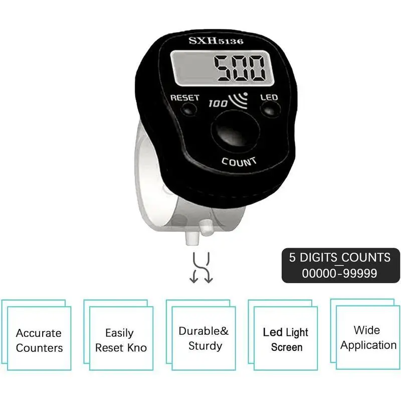 ?Sounding LED ring Buddha counter? style manual counter with lighted ring: Led button can help you see much more clearer at night; Besides, the ring counter will remind you with sound when you count 100, 200 etc. 5 count of hand tally counters in 5 colors, sufficient quantity for your use; Color: as pictures shown.It sits nicely on your finger and keeps a count. You even can use two on one finger to keep track of both stitches and rows. ? Finger Counter with Automatic Sleep Mode?The digit LED screen display of tally counter can counter up to 99999 as maximum number. It shuts itself off after a while. Meanwhile, The digital number goes off after a while when the marker has been inactive but when You press the button it goes right where it ended. ?Handy Good Accurate Tally Counters?Those electric finger counters are So handy, right there on your finger, Make sure you can keep on knitting without missing a beat.Our pitch counter feels quiet and comfortable,No springs to wear out;Smooth surface;The digital clicker can stay securely in your hand. ?WIDE APPLICATION?:Ideal for lab,people, event, golfs,, bar, swimming, concert, ,praty,meeting,restaurant,school,fishing, headcounting,exercises and any occasions where need to be counted for number.In addition to aboves,it still can help learn to count. ? Handy Device to be gifts?: for to keep score; When knitting, No more forgetting which row you was on, especially when your're interrupted by one thing or another;While crocheting, you don't have to take your eyes off your project to find your hand held counter or make a tick mark on paper.Those finger counters are effective, versatile and well worth the !