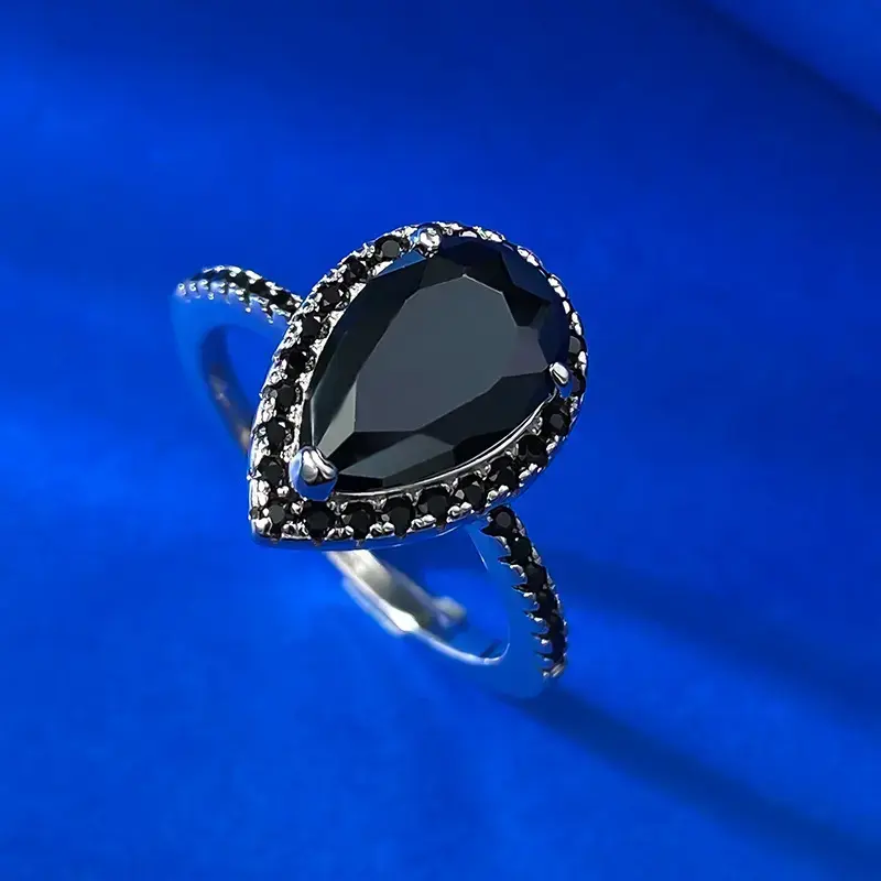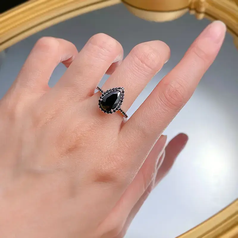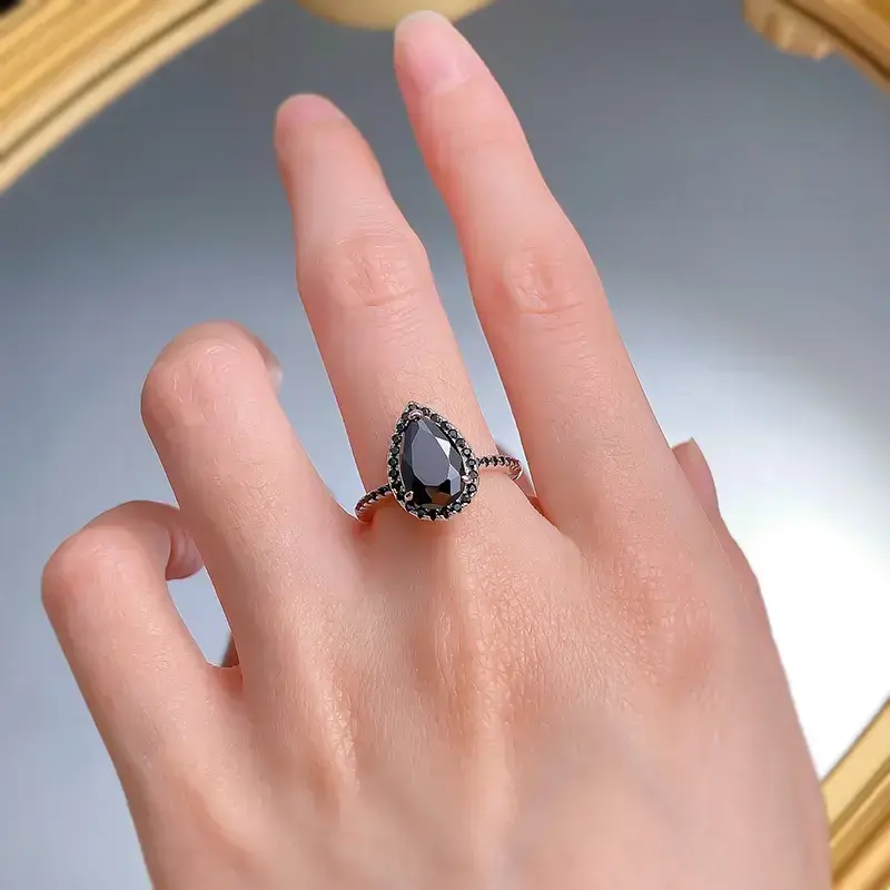 The S925 Sterling Silver Black Teardrop Ring is the epitome of timeless elegance and sophistication. Featuring a striking black teardrop-shaped 5A cubic zircon stone, this ring exudes charm and grace, making it a perfect accessory for any occasion. Its 925 sterling silver construction ensures durability and hypoallergenic comfort, ideal for sensitive skin. Weighing approximately 2g, this lightweight ring is designed for daily wear while maintaining its luxurious appeal. Packaged in an exquisite gift box, it’s an excellent gift choice for birthdays, anniversaries, or special celebrations. The Black Teardrop Ring pairs beautifully with other sterling silver or black accessories for a coordinated, chic look. Wear it as a statement piece or layer it with other rings for a trendy, stacked style. Every Day Elegance The S925 Sterling Silver Black Teardrop Ring is a perfect blend of modern design, sparkling brilliance, and lasting comfort, making it a standout addition to any jewelry collection.