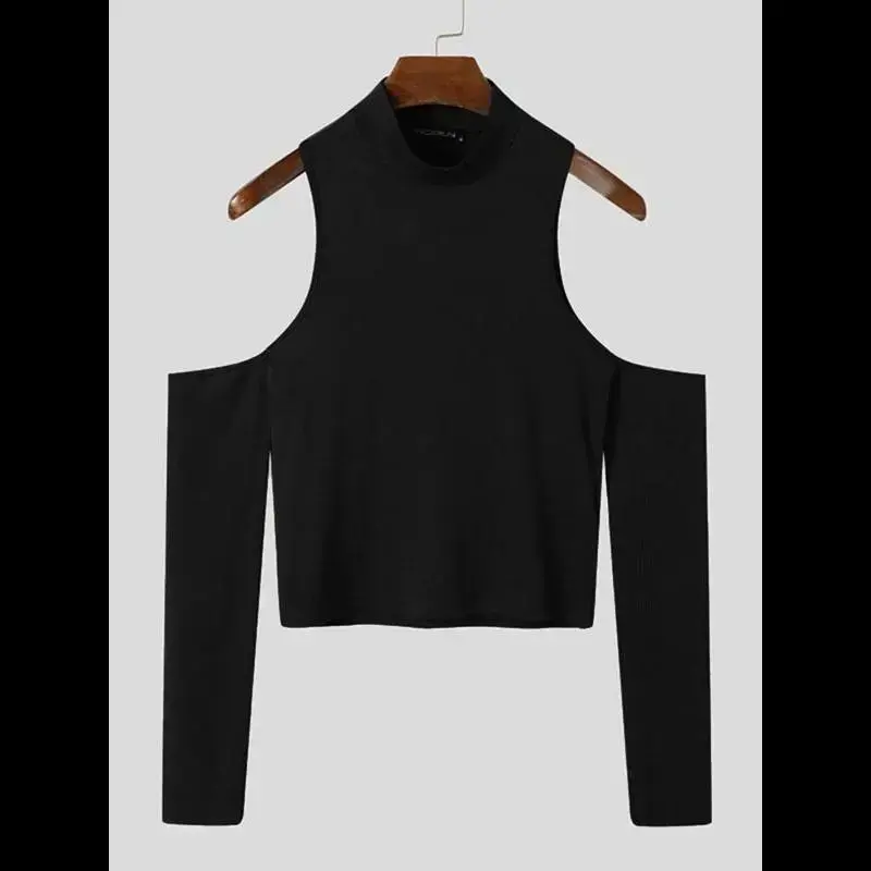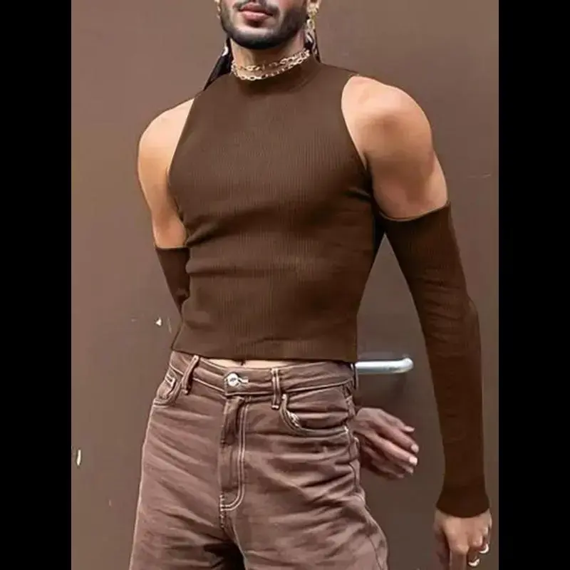 [Slim Fit]: The slim-fitting nature of this tank top ensures it hugs the body comfortably, offering a sleek, sharp silhouette perfect layering or wearing on its own./[Mixed Textile Material]: Crafted from a blend of textiles, this piece promises durability while maintaining a soft against the skin, making it a staple daily wear./[Slight Stretch]: Engineered with a slight stretch, this garment provides sufficient flexibility, ensuring ease of movement without compromising the slim-fit design./[Cut Out Design]: Featuring a unique cut-out design, specifically around the shoulder area, this top apart from traditional menswear, adding a of daring to the wardrobe./[Long Sleeve & Mock Neck]: The combination of long sleeves and a mock neck offers a balance of coverage and sophistication, suitable transitioning between seasons or cooler evenings.