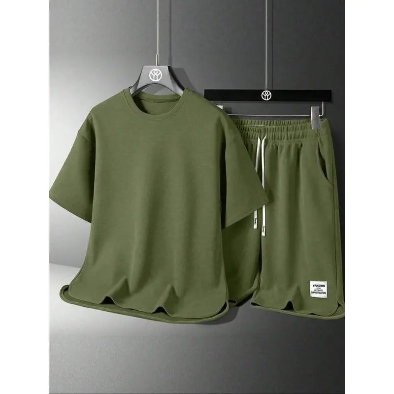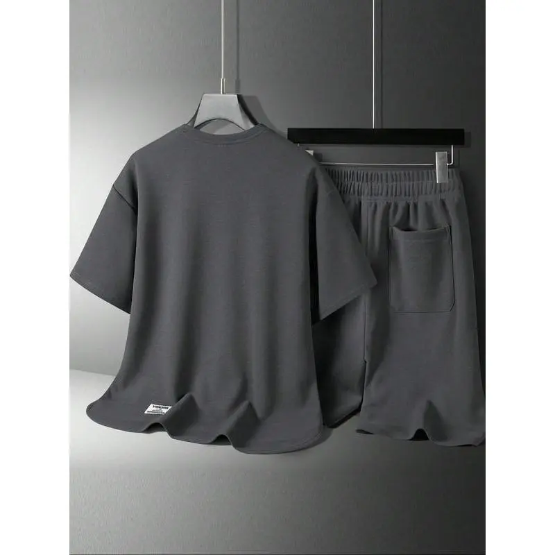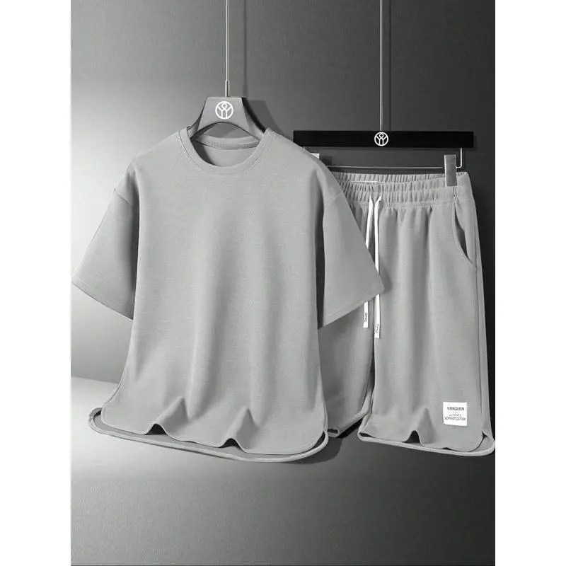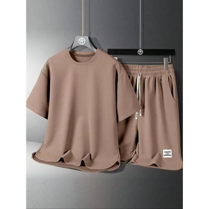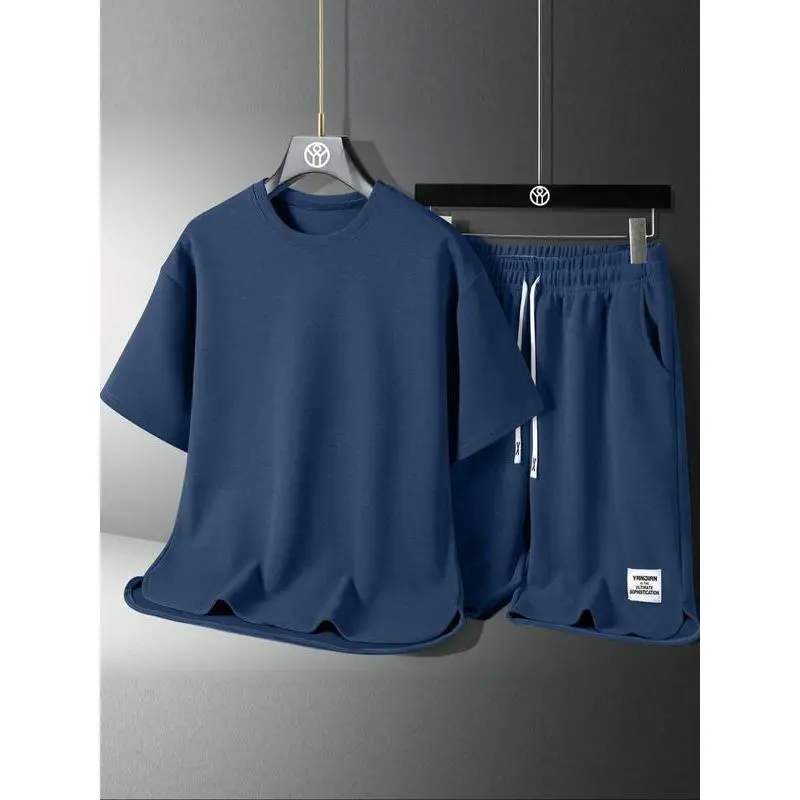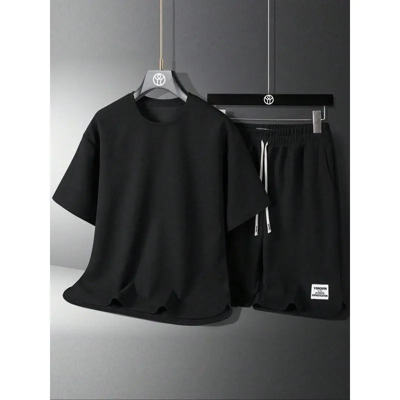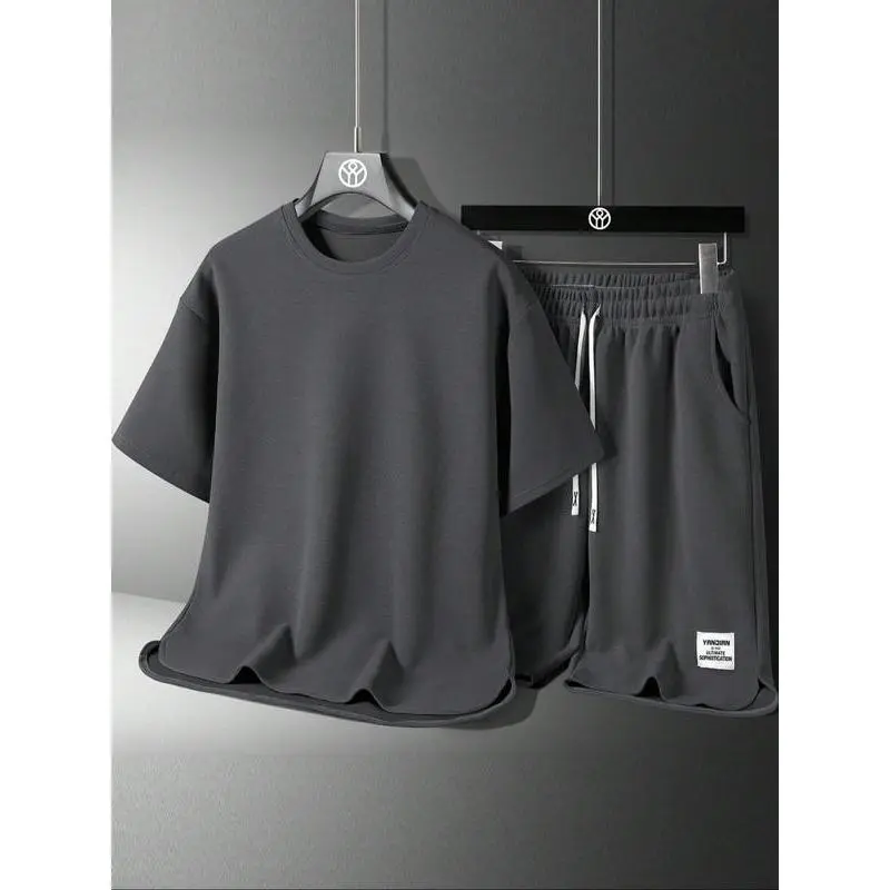Men's Solid Short Sleeve Tee & Drawstring Waist Shorts Set, Regular Fit Casual Round Neck T-shirt & Track Shorts, Men's Summer Clothes
