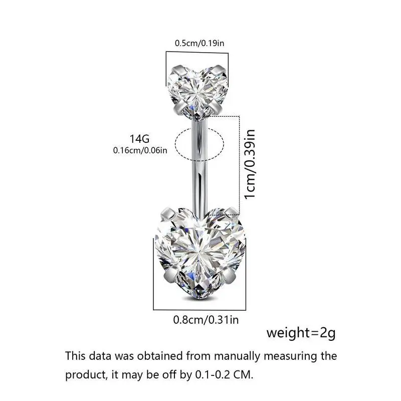 ��Heart-shaped Design��: Show your love and charm with this cute heart-shaped navel ring. ��Versatile Style��: While specifically a navel ring, its design may complement other body piercings, making it a versatile addition to your jewelry collection. ��Precision Craftsmanship��: The navel ring boasts accurate measurements and high-quality stainless steel construction, ensuring a durable and comfortable fit that adheres to strict quality standards. ��Perfect Fit��: With a standard 14G size, a length of 1.0cm, and a width of 0.1cm, this navel ring is designed to fit most body types comfortably, ensuring a snug and perfect fit for your belly piercing. ��All-Occasion Accessory��: Whether you're dazzling at a party or adding a touch of sparkle to your daily wear, this rhinestone heart shaped navel ring is the perfect fashion accessory for various event. ��Comes in Multiple Colors��: Choose the one that matches your mood and outfit.