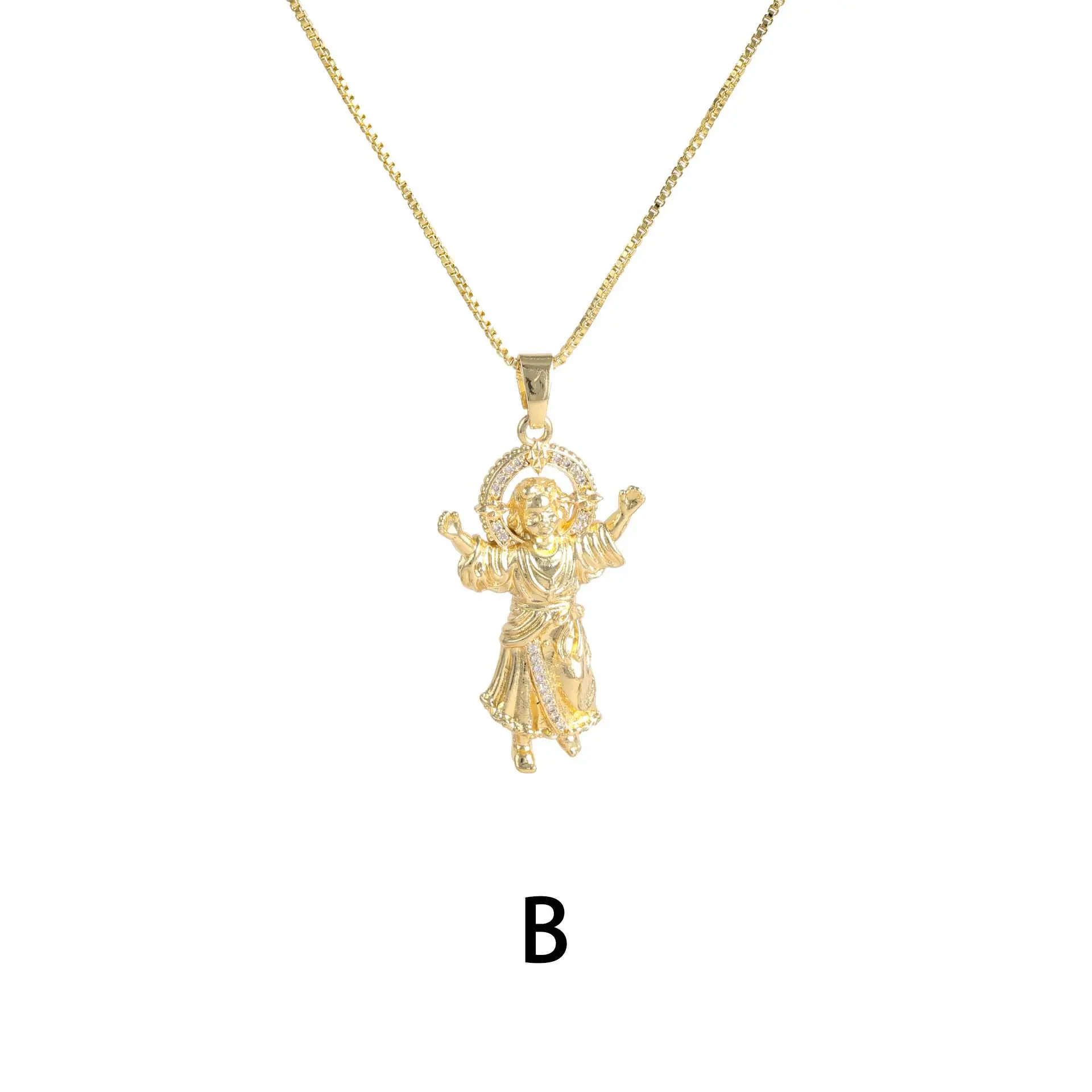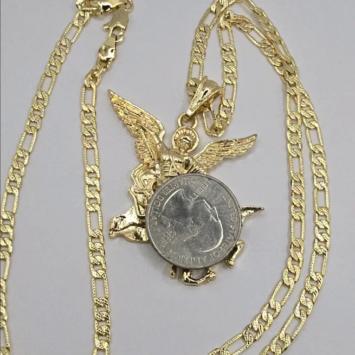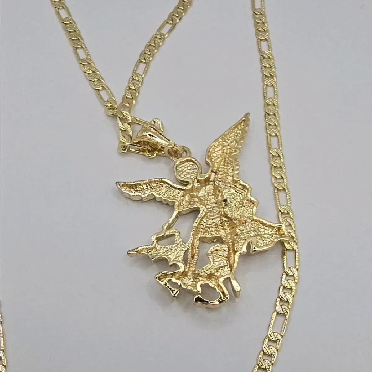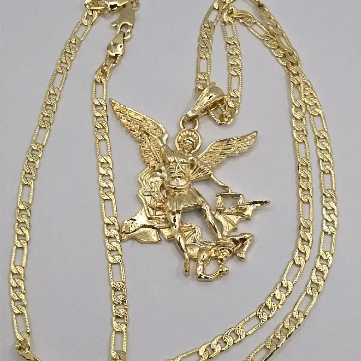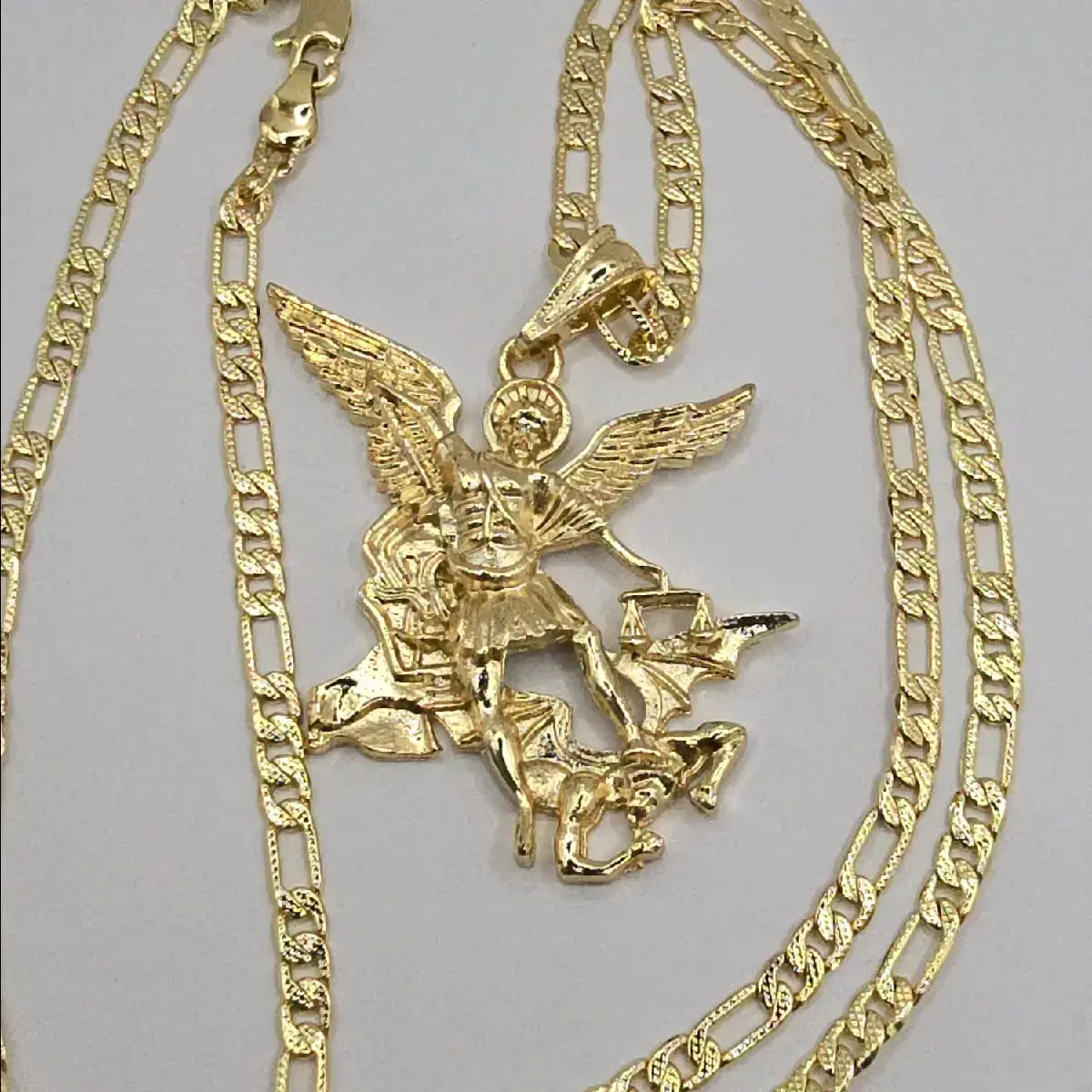 Upgrade your accessories with this stunning Saint Michael's gold-plated figaro-style long chain big pendant today!