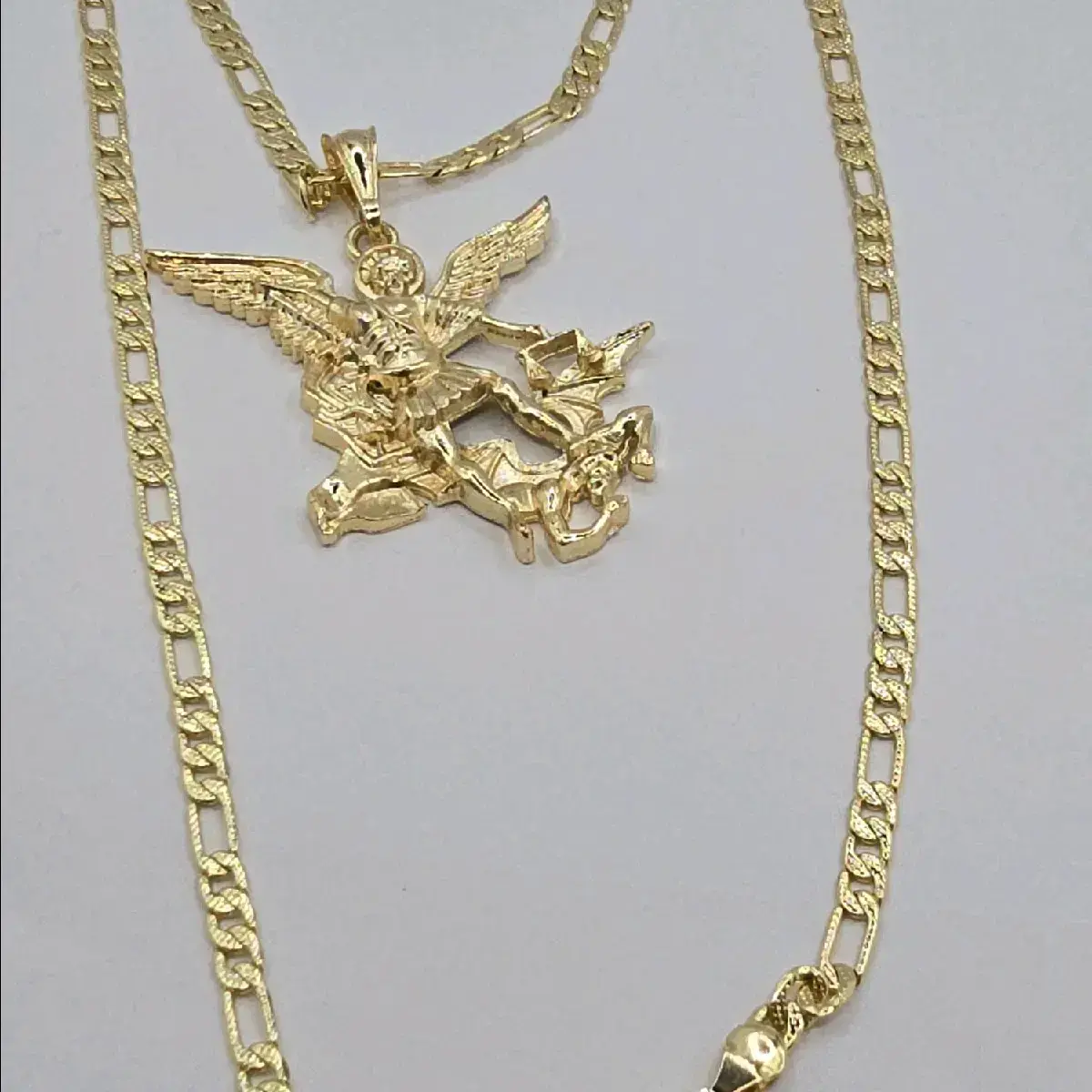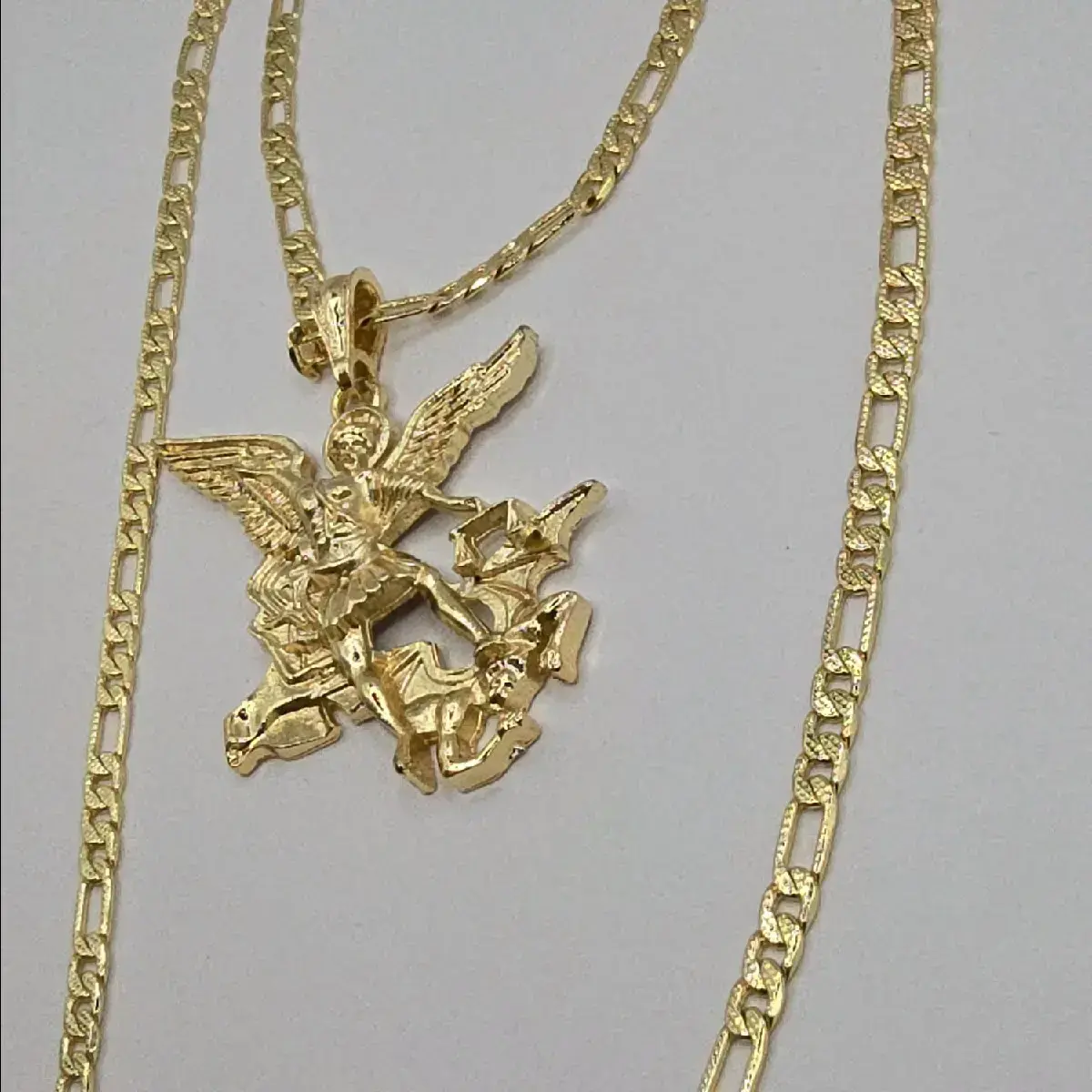 Introducing the Saint Michael's necklace in a stunning figaro style with a beautiful gold-plated long chain and big pendant. Perfect for daily wear, this necklace is made with metal coating that ensures it won't fade or tarnish quickly. Just make sure not to wear it while taking long showers, and you'll have a gorgeous piece that lasts.