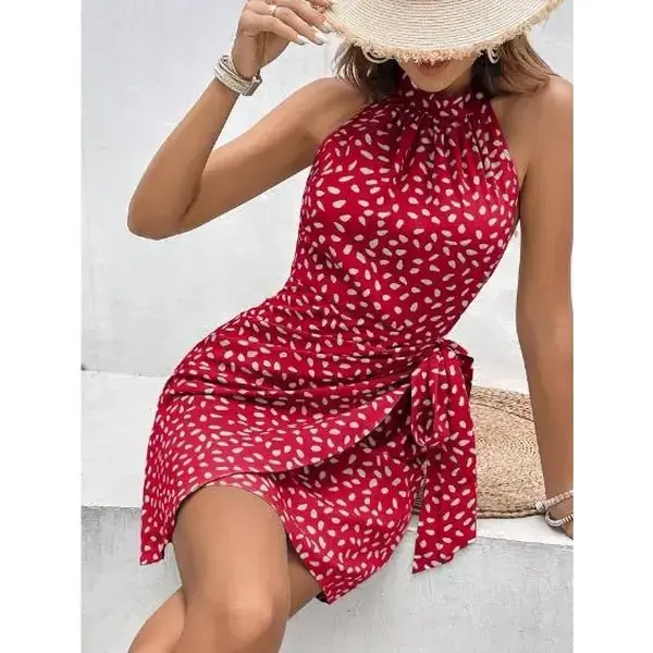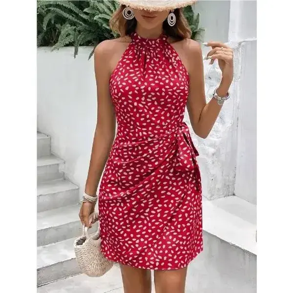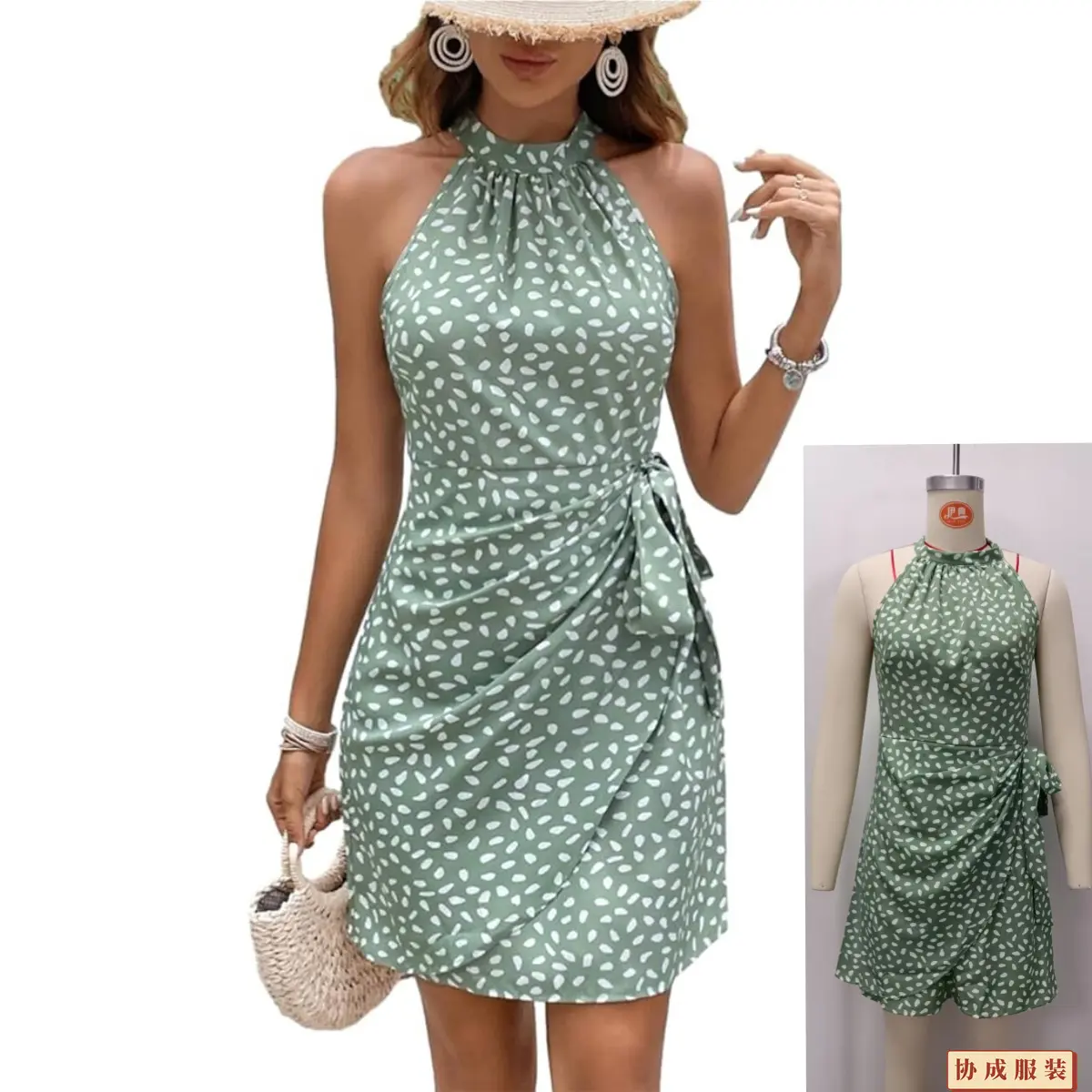 Slay every look with this halter polka-dot dress! Stylish navy-white dots + wrap tie design—ideal for daily slays or vacay fits. Trendy & figure-flattering—snag now for instant TikTok-viral style! 2024 Amazon Cross-Border Hot-Selling European and American Style Tie Polka Dot Ruched Dress Sleeveless Waist-Tied Halter Dress