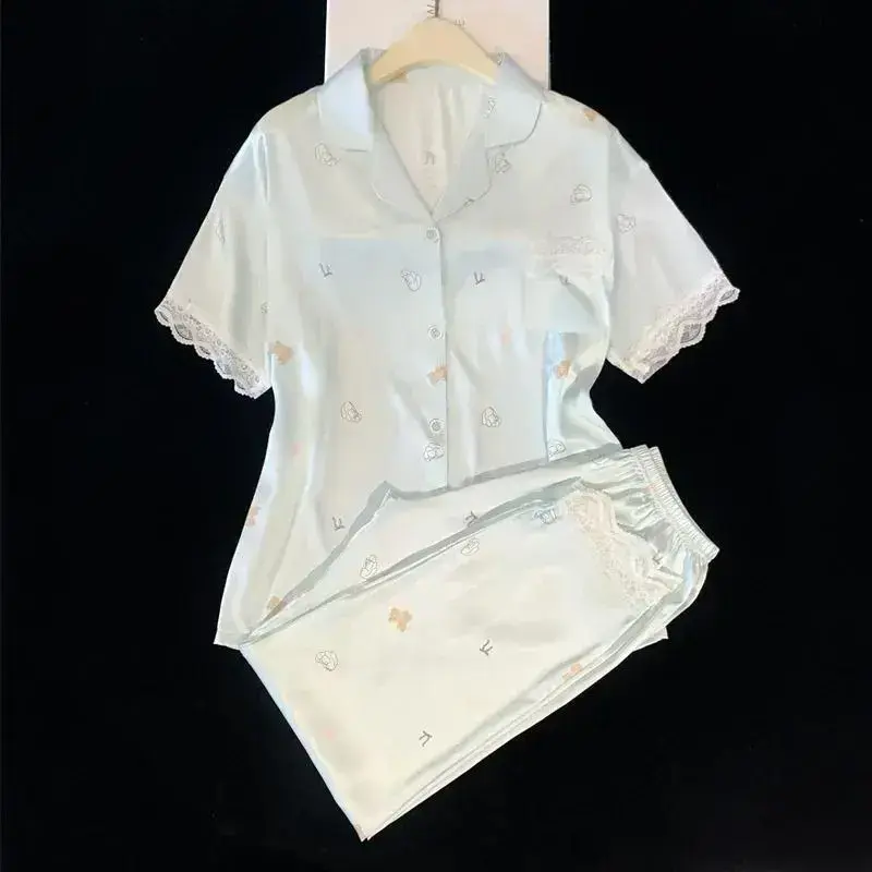 Korean Cartoon Little Bear Sweet Women's 2pc Pajamas Cute Simple Y2k Lace Sleepwear New Autumn Short Sleeve+pant Set Loungewear Womenswear