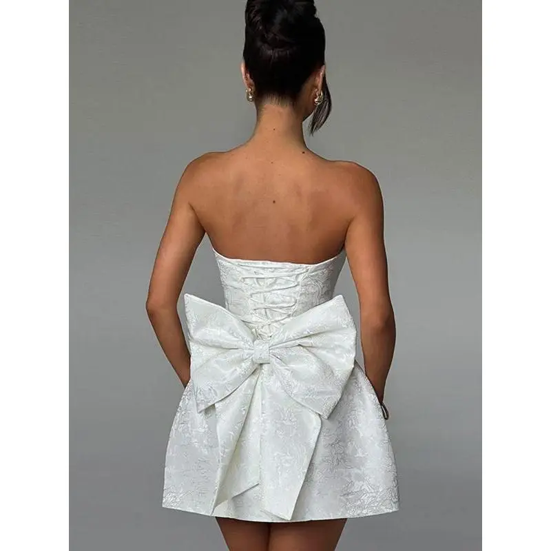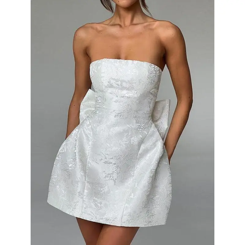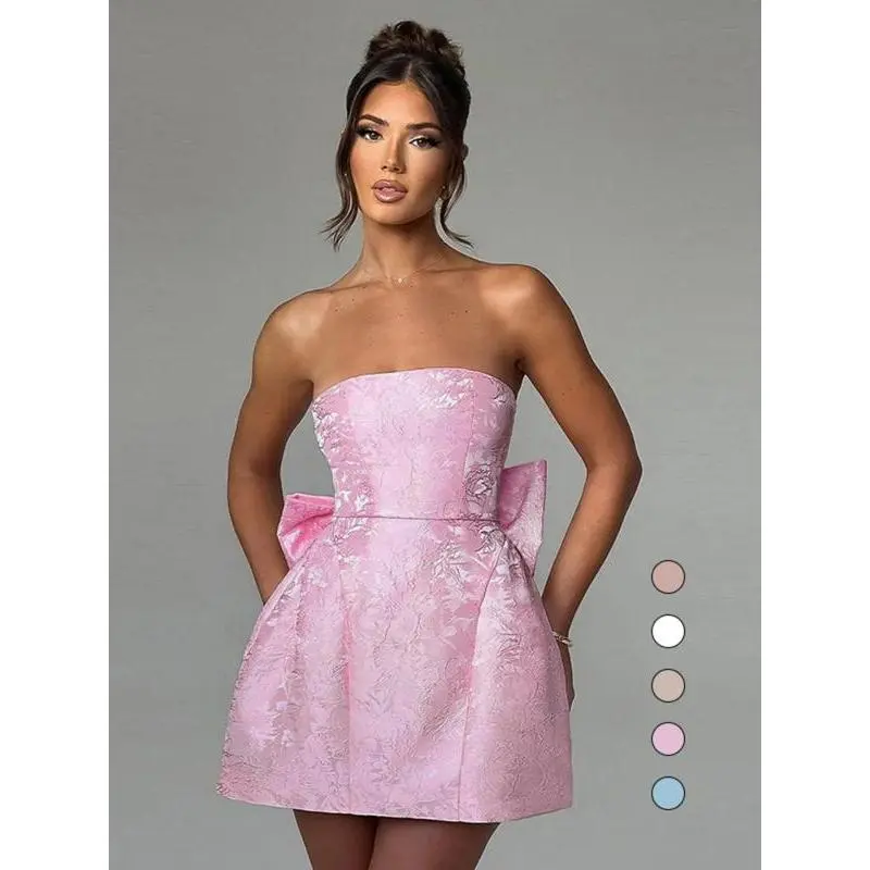 Women's Floral Pattern Lace Up Bow Back Tube Dress, Elegant Strapless A Line Short Dress for Party Holiday Wedding Guest, Ladies Summer ClothesGift