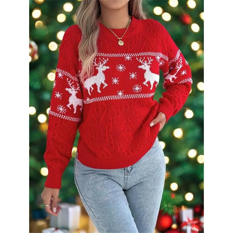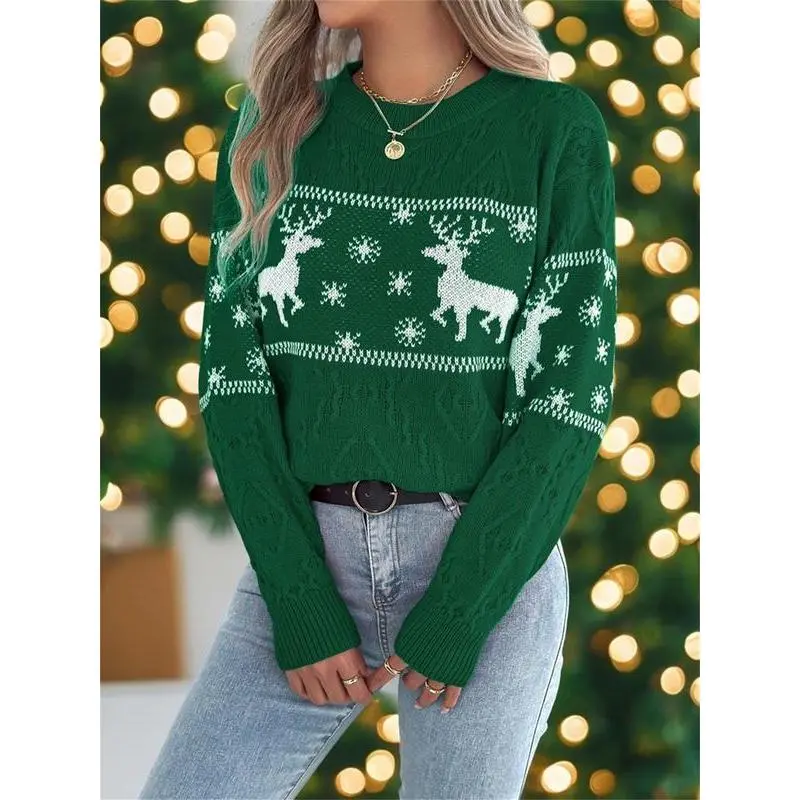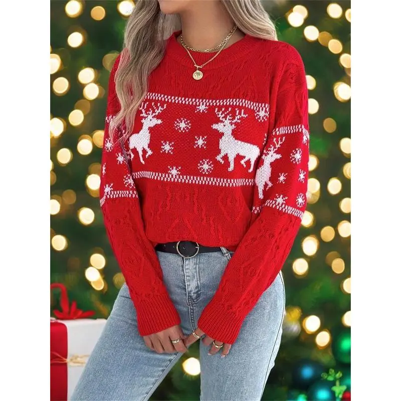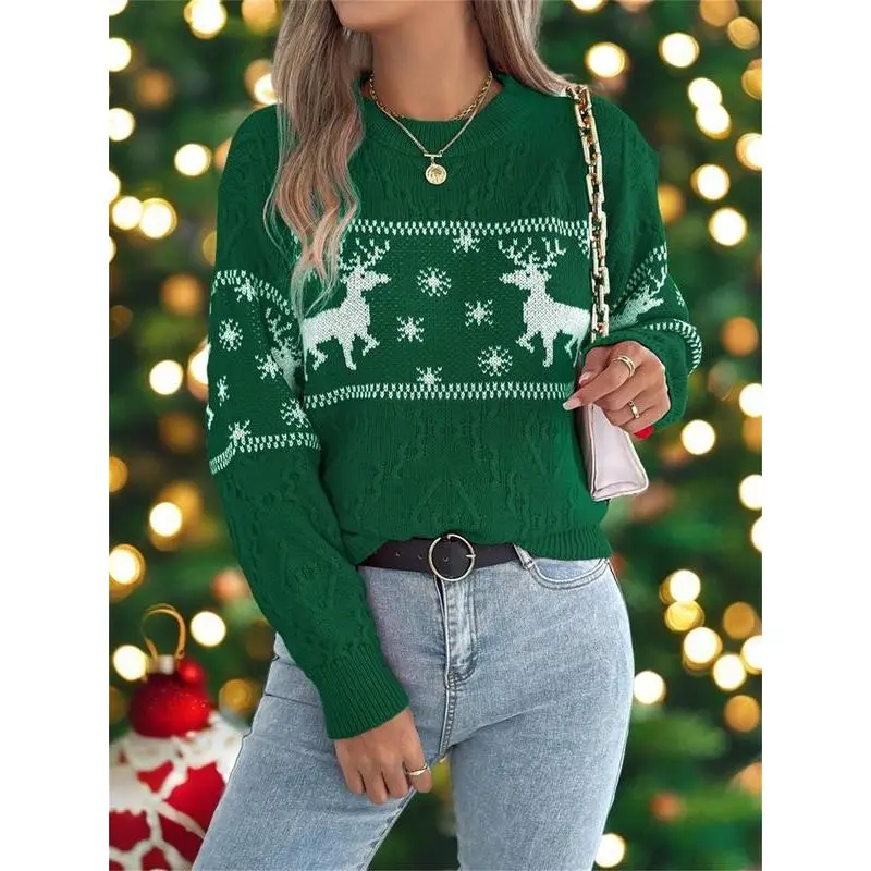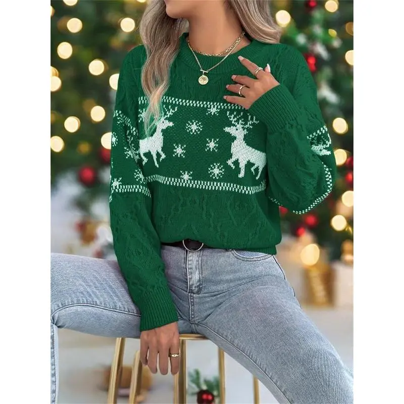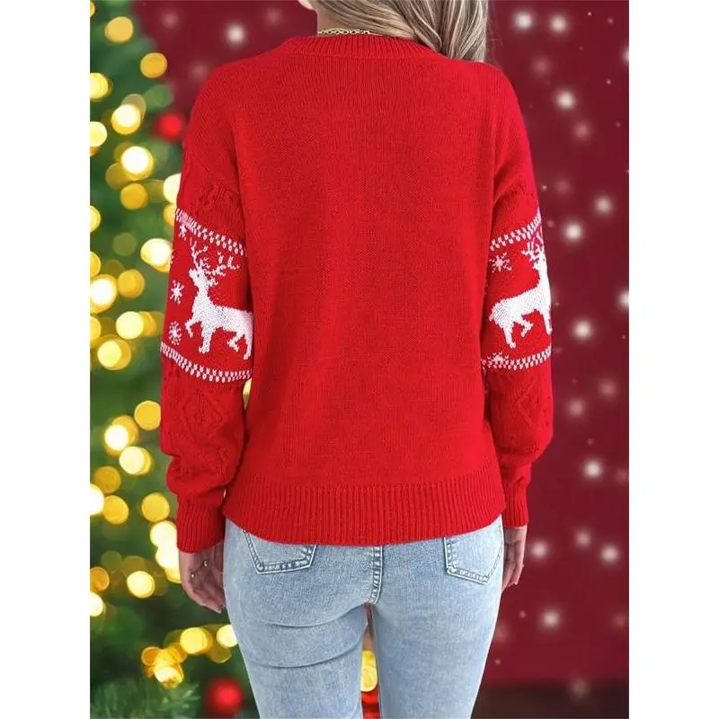 Women's Christmas Reindeer Print Drop Shoulder Sweater?Pullover, Casual Long Sleeve Round Neck Jumper for Fall & Winter, Ladies' Knitwear for Daily Wear