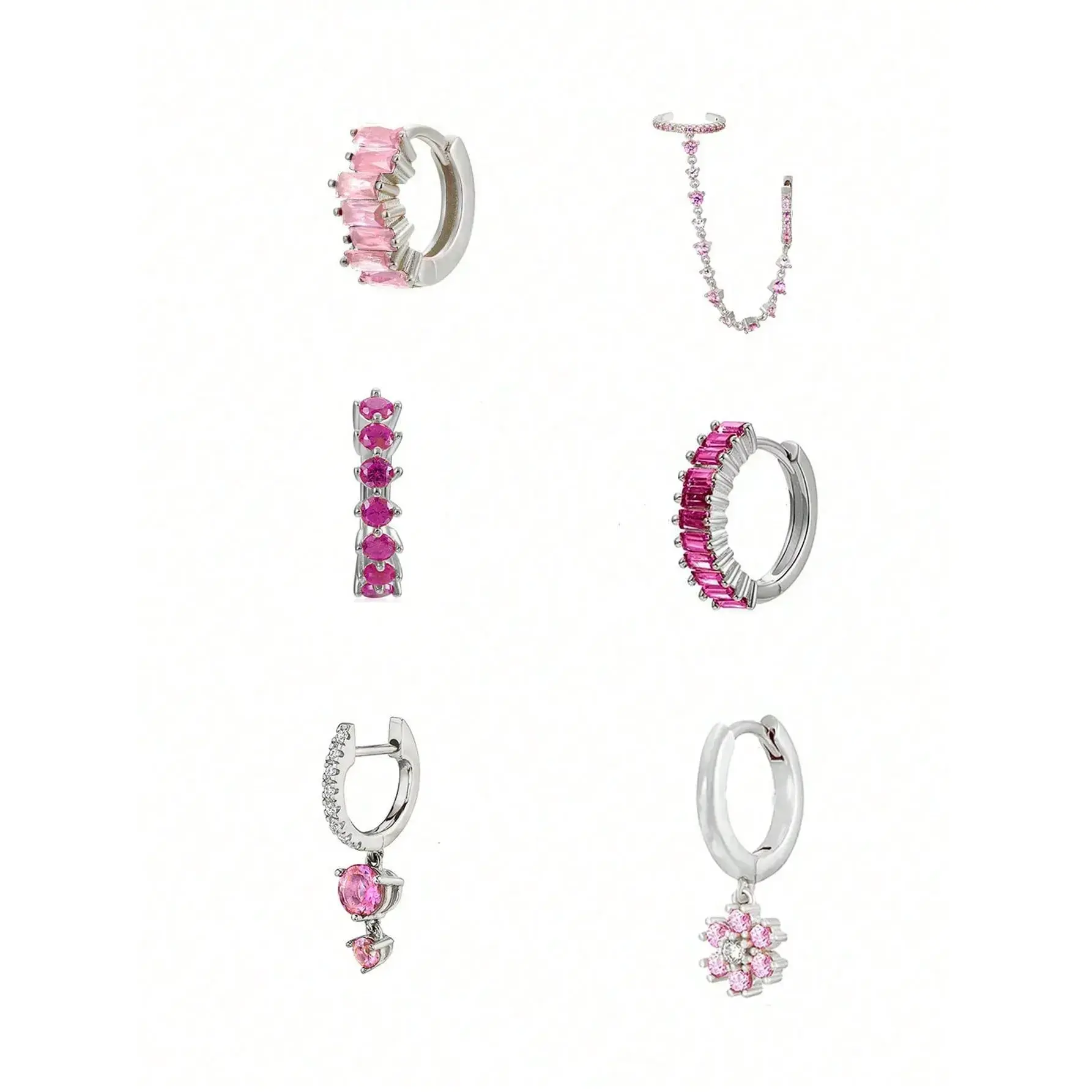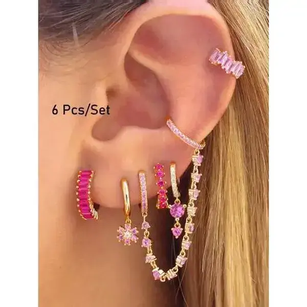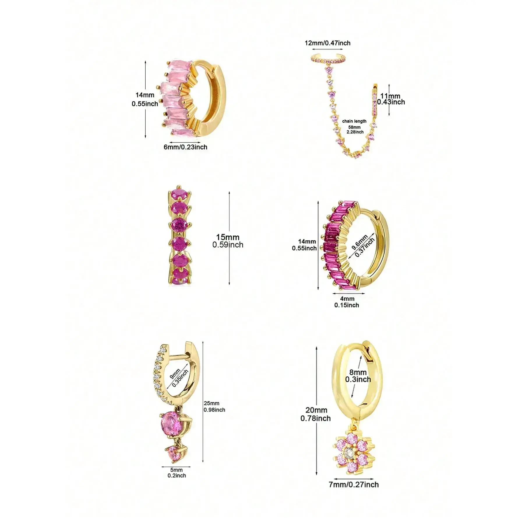 6Pcs Lovely Gold Plated Cubic Zirconia Dangle Earrings For Women Pink Zirconia Flower Hoop Earrings Set Fashion Jewelry