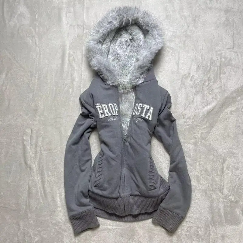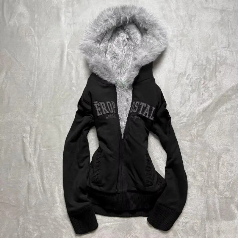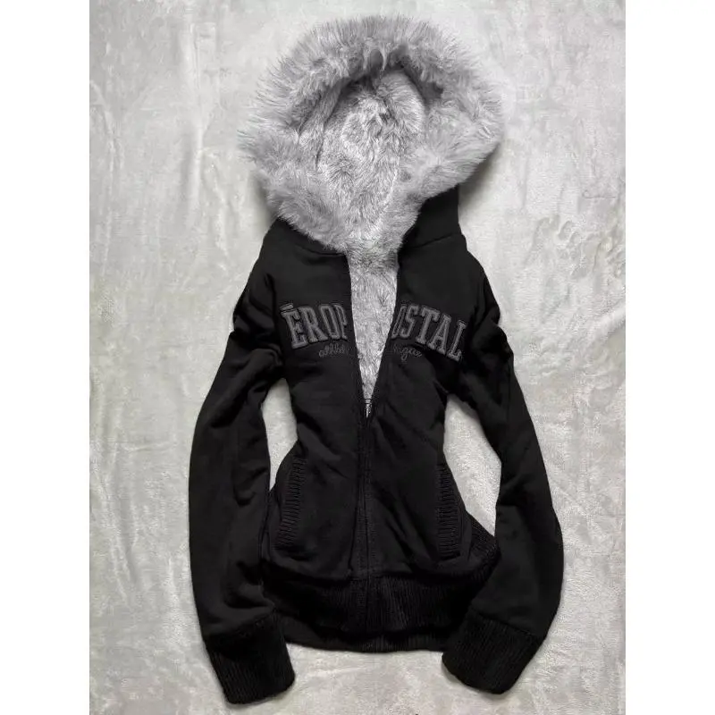 American original gray thickened hooded sweatshirt jacket for women retro slim hottie design warm zipper jacket