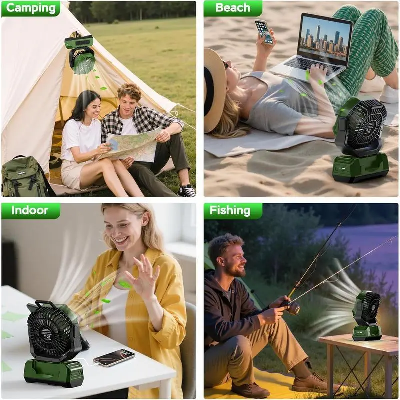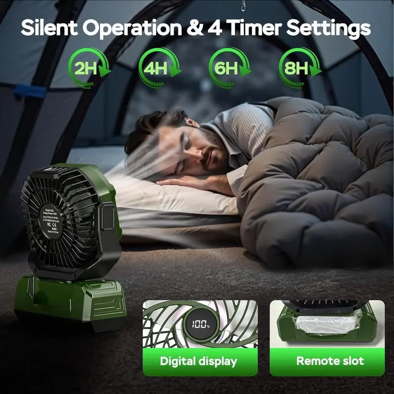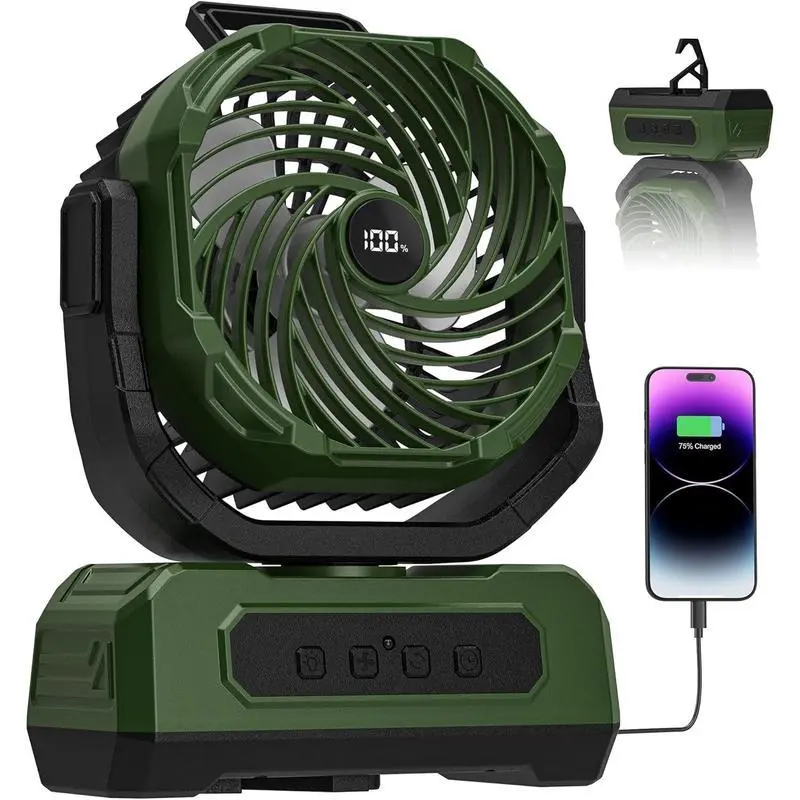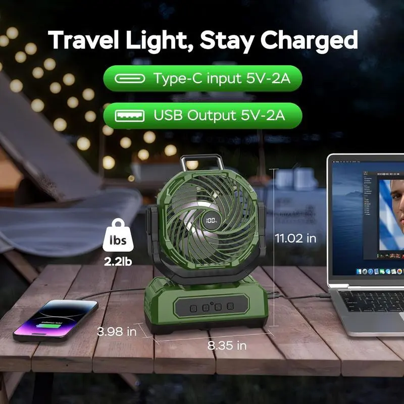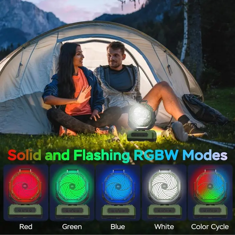 [Strong Wind, Quiet Operation]: This camping fan features 4 adjustable wind speeds and 4 timer settings for a personalized experience.Its quiet design ensures that you can enjoy a powerful breeze without any distractions, making it ideal for a peaceful outdoor environment[20000mAh Rechargeable Battery]: Enjoy 16 to 48 hours of runtime depending on the speed setting.This fan also acts as an emergency power source, allowing you to charge devices like phones, tablets, and small electronics during power outages or outdoor trips.The Type-C charging cable and digital display keep you informed of battery levels and fan settings[RGB Lighting for Ambiance]: Equipped with 6 LED lights, this fan offers three colors: red, green, and blue.You can choose a steady light or enjoy the slow/fast automatic color-changing mode that switches between red, green, and blue, perfect for setting the right atmosphere during your camping trips or outdoor evenings[Adjustable Airflow and Convenient Design]: With 120° automatic oscillation and 90° manual tilt, this fan provides precise control over airflow direction.The foldable hook design and convenient handle make it easy to hang the fan in a tent or carry it with you, while the included remote control offers added convenience for adjusting settings without having to move[Compact and Lightweight]: With compact dimensions of 8.35" x 3.98" x 11.02" and weighing just 2.2lbs, this fan is portable and fits easily into your backpack. Ideal for RV travel, hiking, camping, fishing, picnics, job sites, or even as a desk fan, it’s the perfect companion for any outdoor adventure or home use