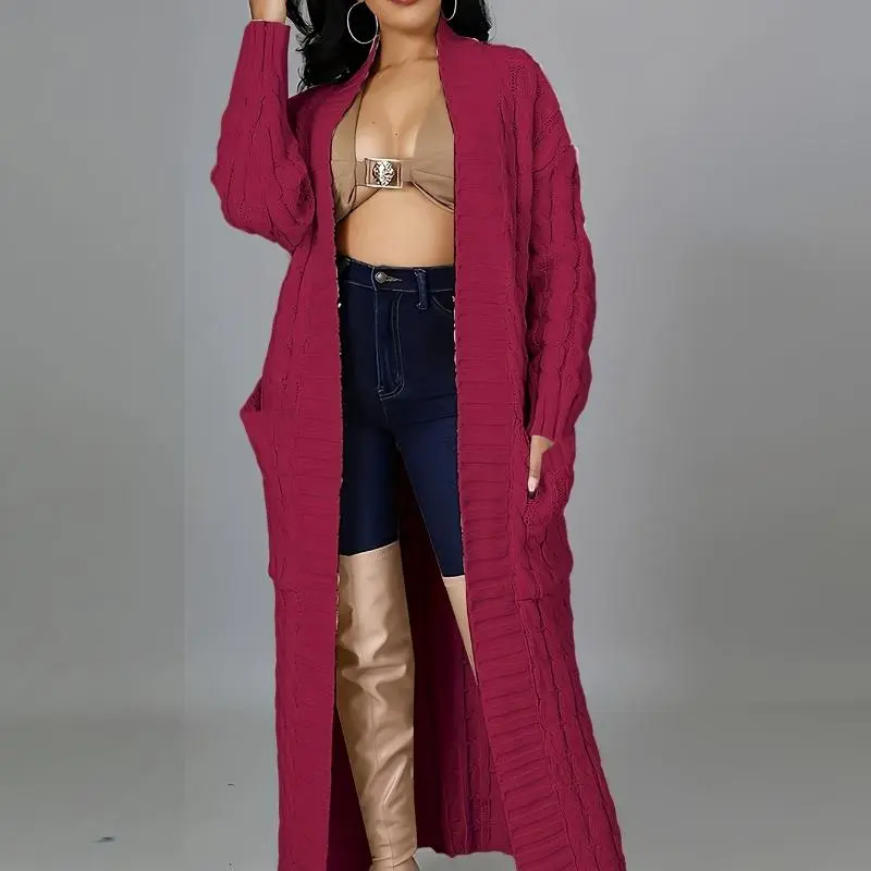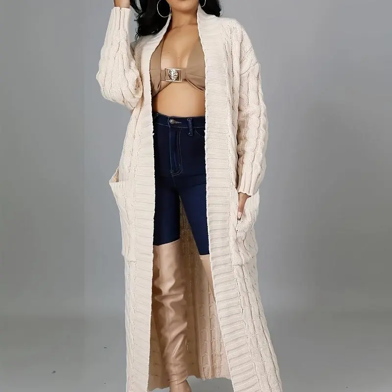 Fashion Women's Clothing Long Length Cable Knit Cardigan - Elegant Solid Long Sleeve Sweater With Pockets - Women's Clothing - Fall/Winter - Suitable Casual Formal Occasions - Women