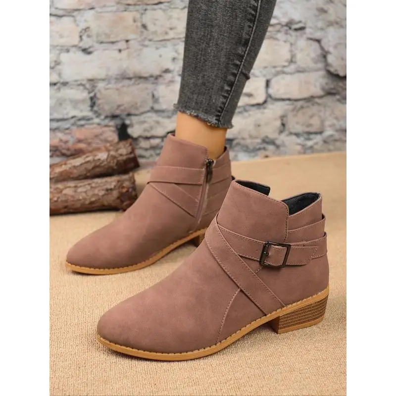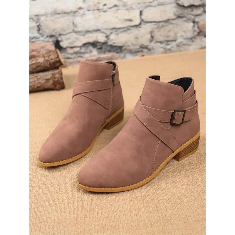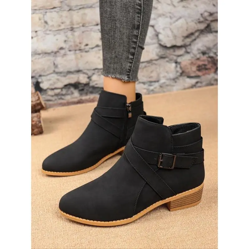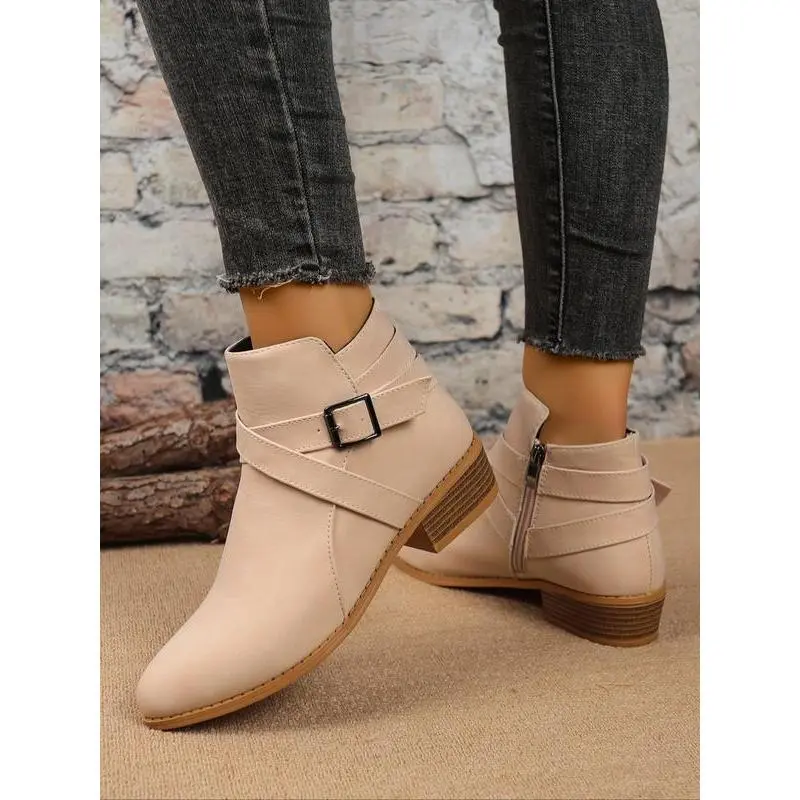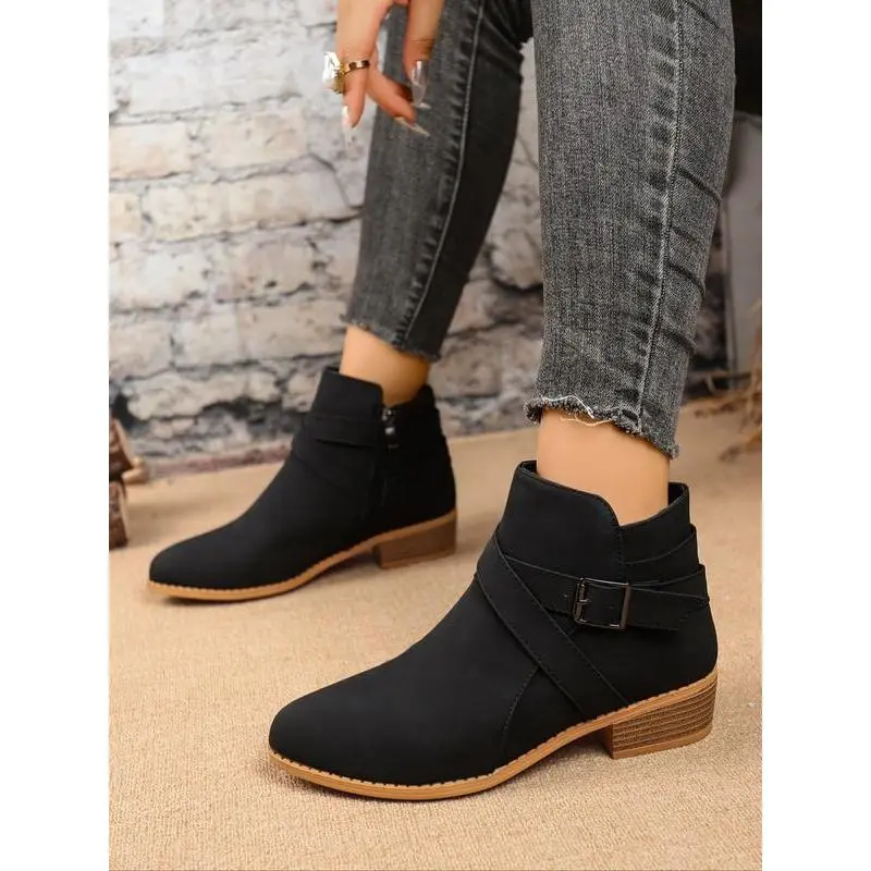 【Unique Buckle】: The buckle design adds a distinctive touch, setting these short boots apart from conventional styles. 【Durable Material】: Crafted from high-quality PU leather, ensuring lasting use while maintaining a sleek appearance. 【Rubber Sole】: Equipped with a robust rubber sole for enhanced traction, providing stability in various conditions. 【Ideal Seasons】: Specifically designed for fall and winter wear, combining functionality with seasonal aesthetics. 【Ankle Height】: Constructed as a less than ankle height boot, providing ease of wear and adaptability to different outfits.