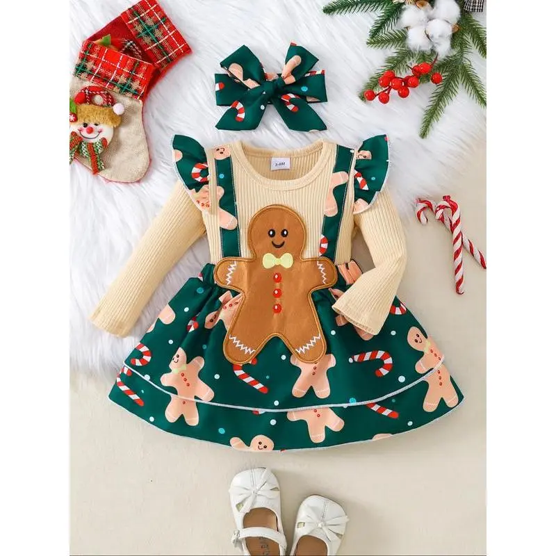 【Festive Print】: Features a unique gingerbread man print, adding a cheerful holiday charm to the outfit. 【Multi-layer Skirt】: Showcases a tiered skirt design, enhancing playful movement and a whimsical appearance for girls. 【Knit Top】: Constructed with a knitted upper, providing warmth and coziness suitable for fall and winter occasions. 【Included Accessories】: Comes with a matching hair accessory, elevating the set and ensuring a coordinated festive look. 【Fit Specification】: Designed with a fitted style, offering a flattering shape while allowing ease of movement for active wear.
