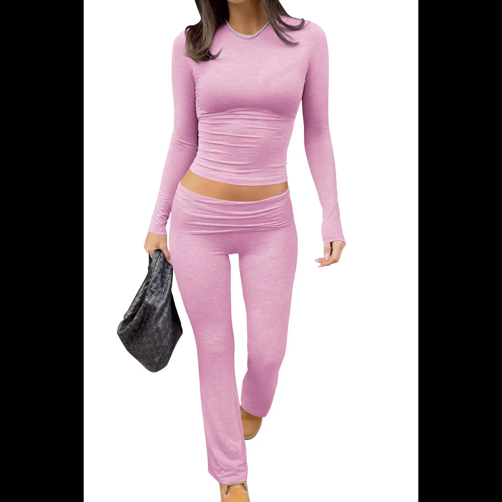 ✨ Elevate your casual style with the CasualWorkoutWomen'sTwoPieceSet! This set includes a round-neck T-shirt and low-waist flare pants, perfect for a tracksuit outfit. The composition features 8% spandex, ensuring comfort and flexibility. Ideal for leisure activities, this set is suitable for autumn wear. 🍂 This two-piece set is perfect for casual outings, workouts, or everyday wear. The solid pattern and long sleeves offer a versatile look. Stay comfortable and stylish with this set. 🌟