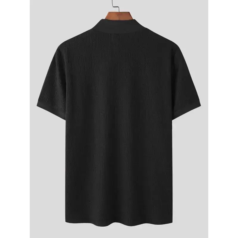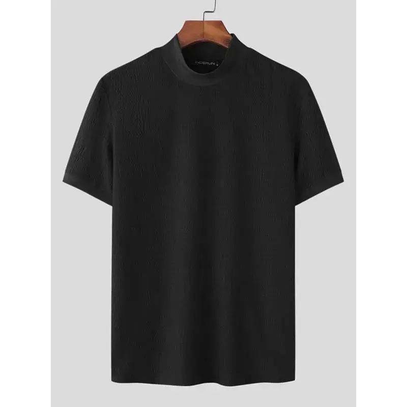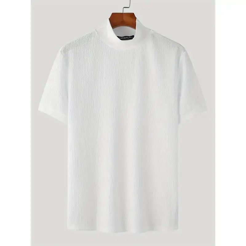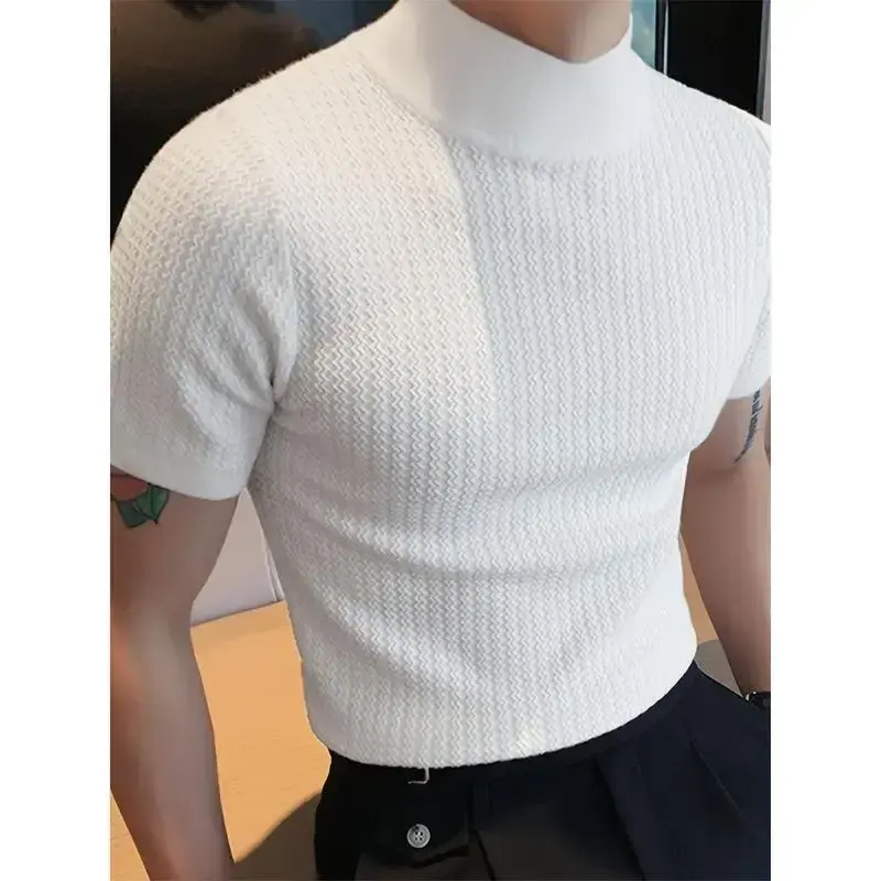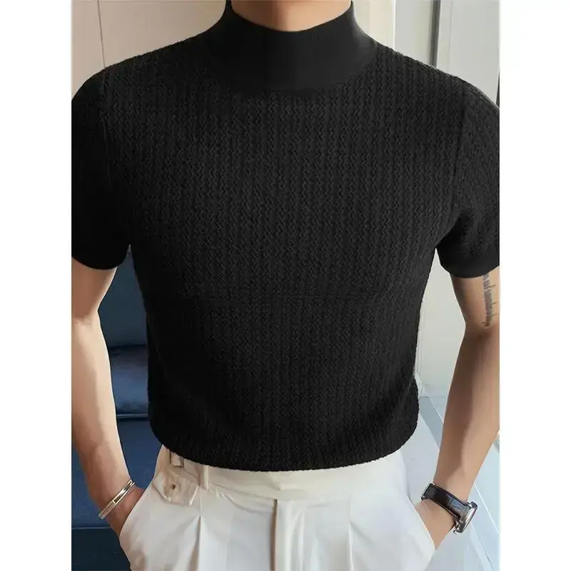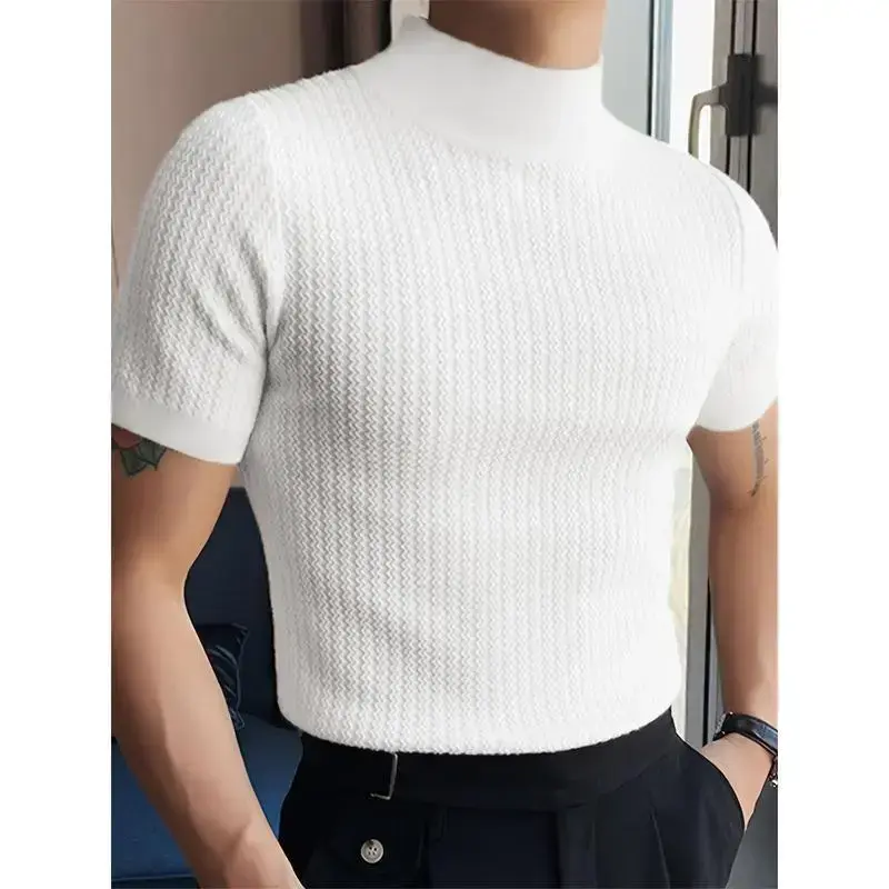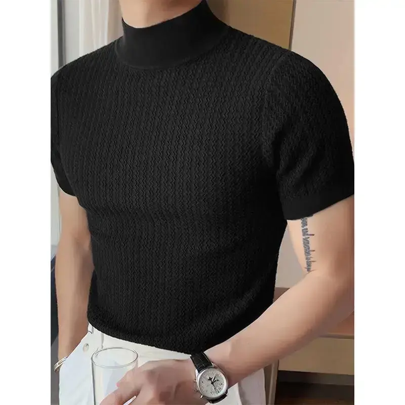 Men's Turtleneck Rib Knit T-shirt, Polyester Blending, Casual Solid Color, Slim Fit, Slightly Elastic, Suitable for Short Sleeve Sports Tops Streetwear White Knitwear Menswear Black Collar Spandex Fabric Knife Tshirt