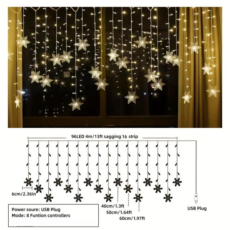 [Snowflake Design]: Features unique snowflake shapes in a 13ft string of lights, adding a festive touch to any setting. [USB Powered]: Designed for convenience, these lights can be powered through any USB port, simplifying use across various locations. [Indoor and Outdoor Use]: Versatile for both indoor and outdoor settings, making them perfect for decorating bedrooms, patios, and gardens. [LED Efficiency]: Equipped with 96 LED lights that are energy-efficient, providing bright illumination while consuming less power. [Easy Installation]: Quickly set up the string lights with hassle-free installation, enhancing your holiday décor with minimal effort.