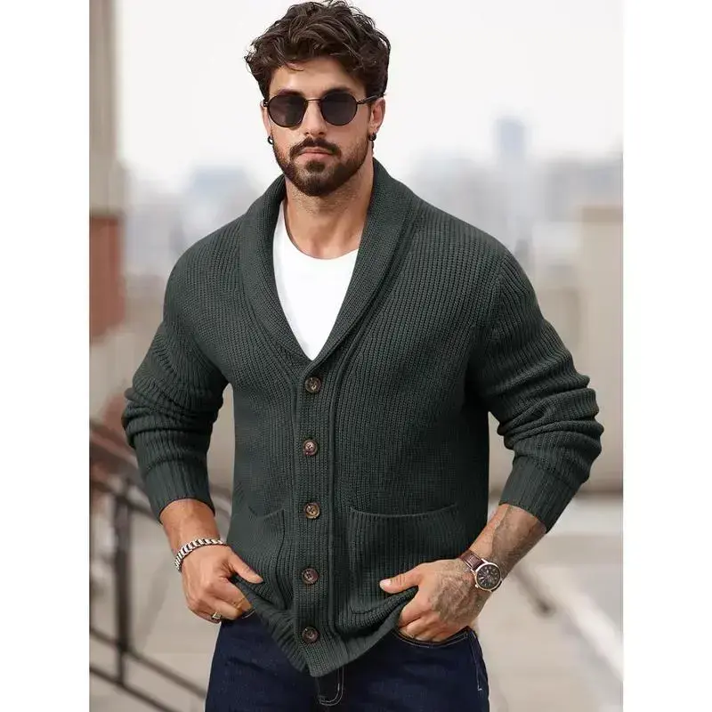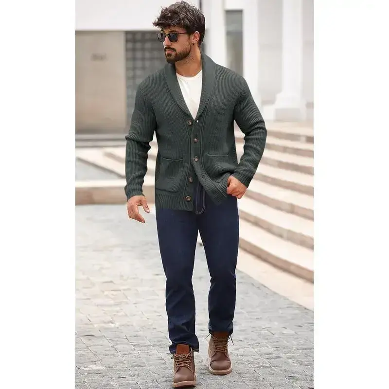 Mens Shawl Collar Cardigan Sweater Button Down Ribbed Knit Sweaters Chunky Casual Cardigan with Pockets Knitwear Menswear Vneck Long Sleeve