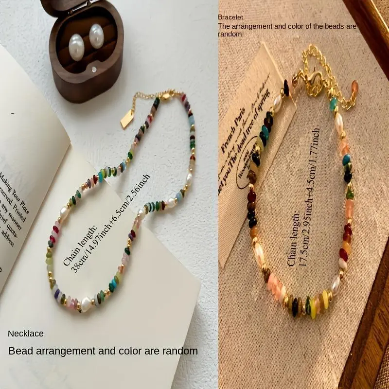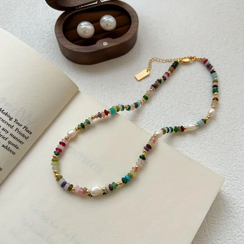 Bohemian Vintage French-Inspired Necklace - Freshwater & Multicolor Natural Stones with Golden-Tone Clasp, Layered Beaded Chain for Everyday or, Year-Round Wear Gift6Gift
