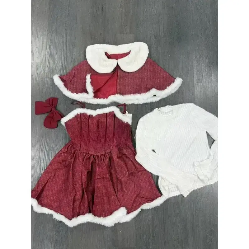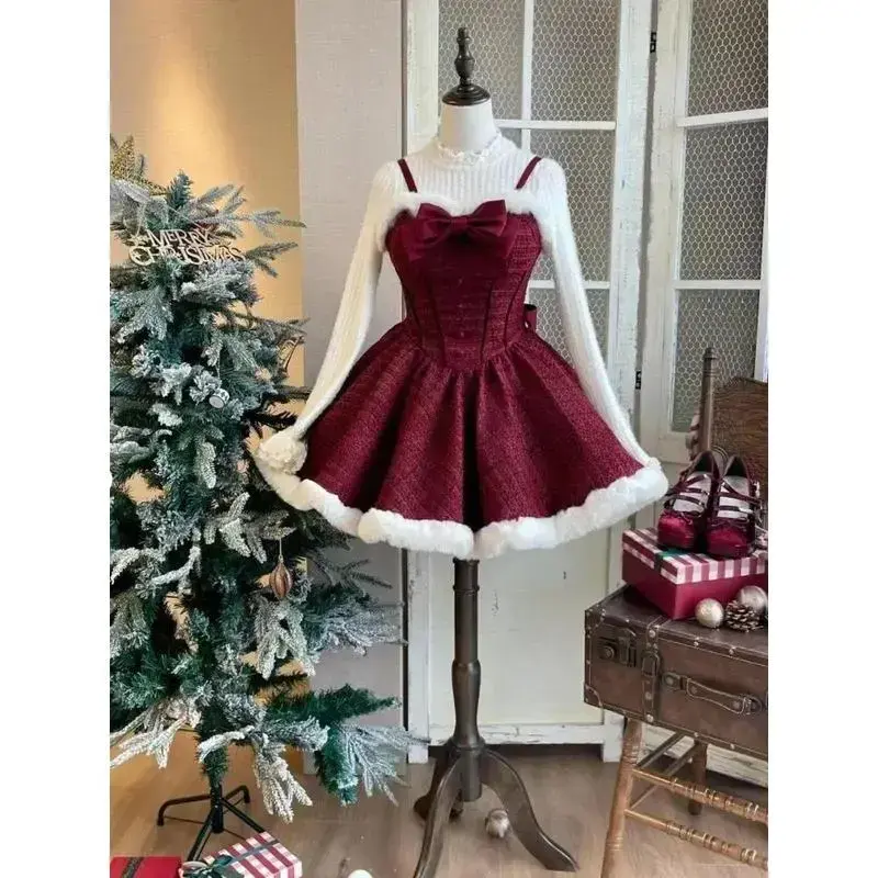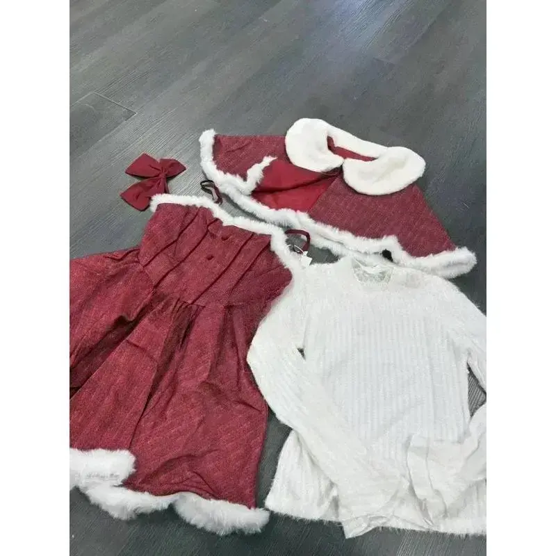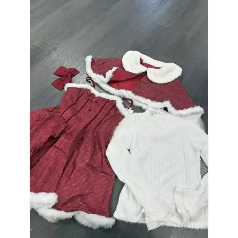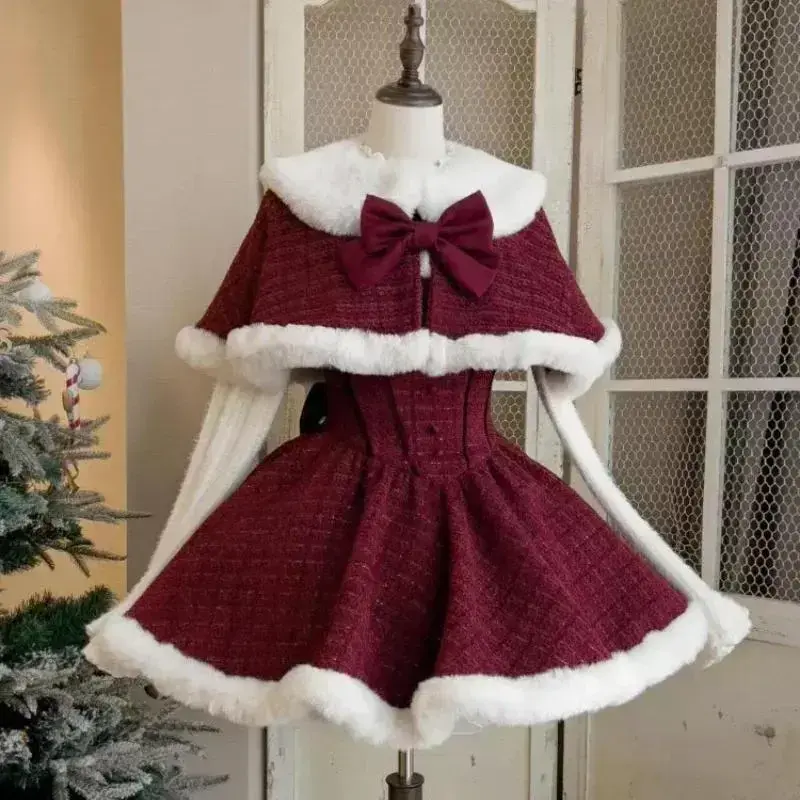 Christmas Red Vintage Suits Women Casual Cloak Coast + Sleeveless Mini Dress Faux Fur 3 Piece Dress Sets Evening Party Outfits Can be used with raincoat