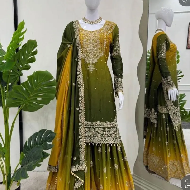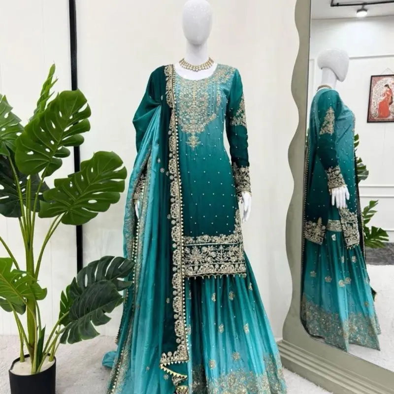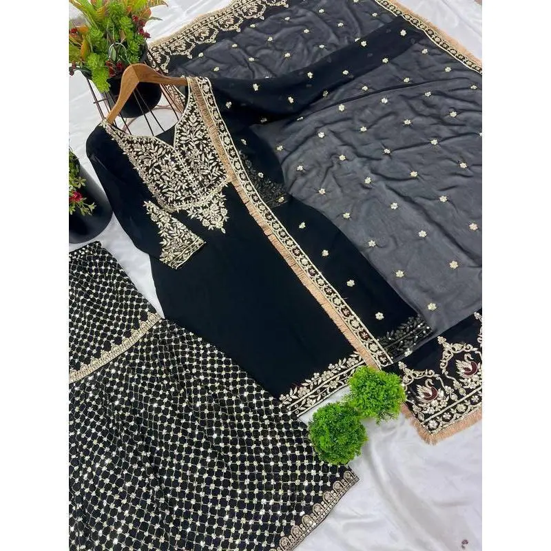 Designer Faux Georgette Sharara Suit Set with 5mm Sequin Embroidery|(Production time 7-15 working days)Fully Stitched Plazzo & Dupatta| Party Wear Dress for Women Formal Costumes