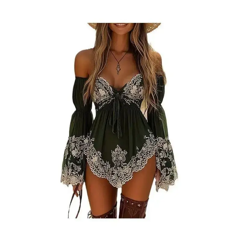 Autumn Retro Denim Sexy Style Women's Floral Dress Holiday Casual Beach Dress Sundress Outfits Boho Earthy Girl Clothes