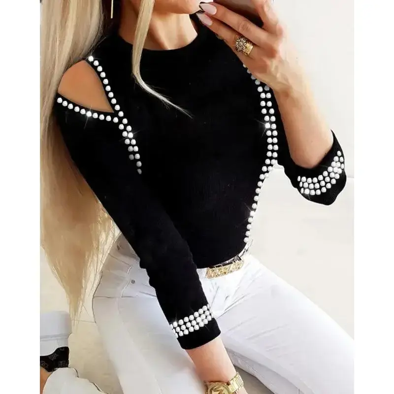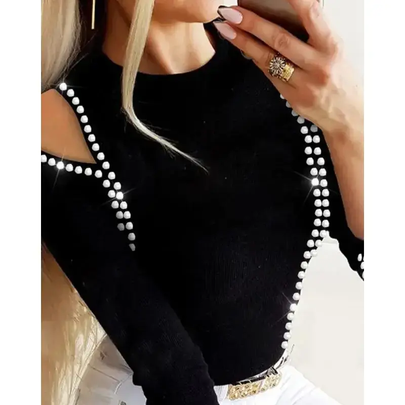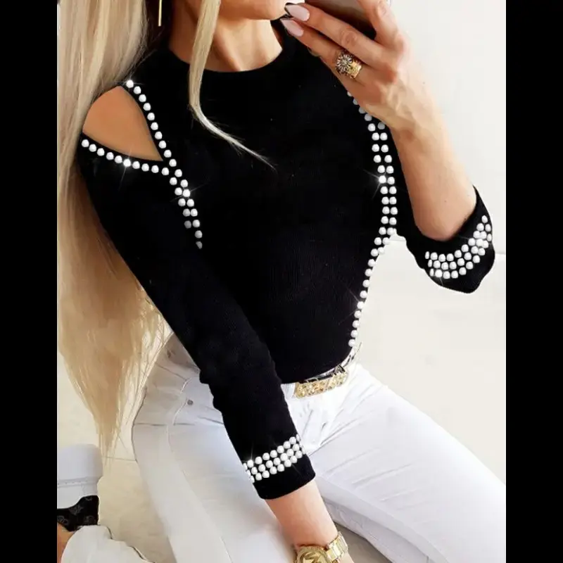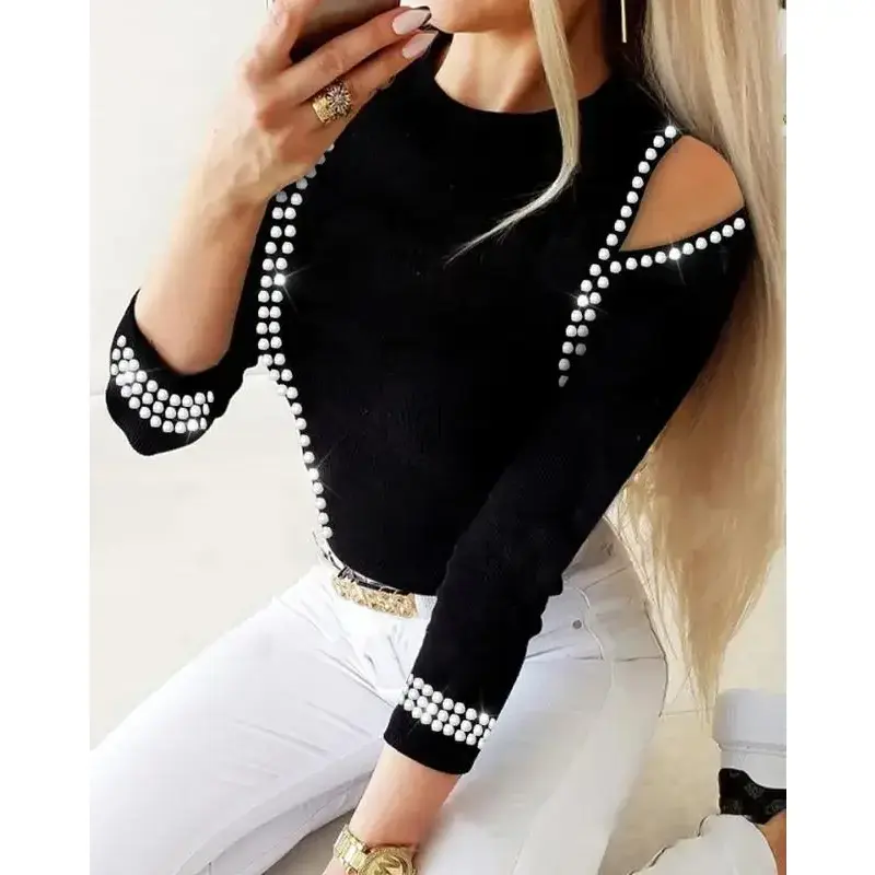 Elevate your wardrobe with our Trendy Hollow Out Rhinestone Blouse. Made of high-quality polyester fabric, it offers slight stretch and a slim fit for maximum comfort. The hollow out and rhinestone decoration add an artistic touch to this solid-colored blouse. Perfect for casual wear in any season.