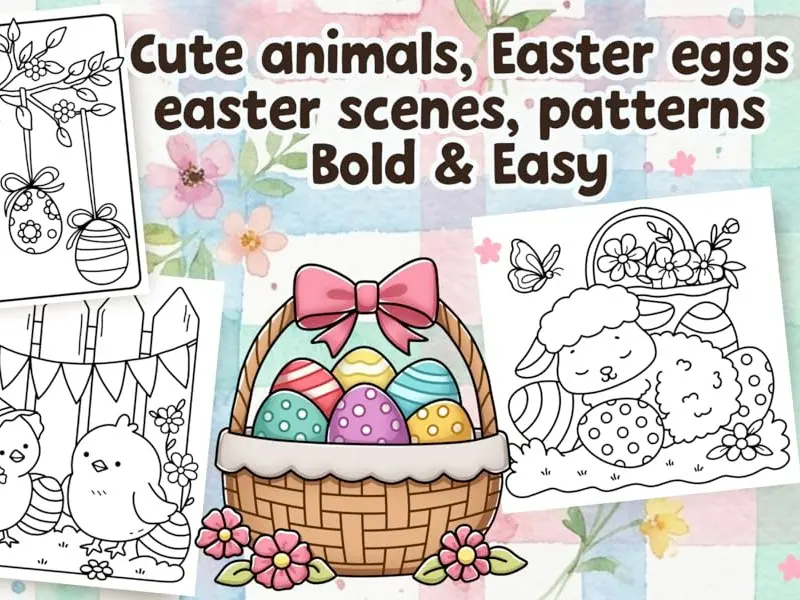 Cozy Easter Bold and Easy Coloring Book includes 50 heart-warming pages. Features bunnies, chicks, Easter eggs, and cute scenes. Bold, thick lines and easy-to-color spaces make it delightful for all ages. Check the interior pages to see the adorable designs! Big, bold, and easy coloring pages offer a fun, relaxing experience without a big time commitment. No overwhelming details or complicated designs. Cute details make it not too easy or boring.