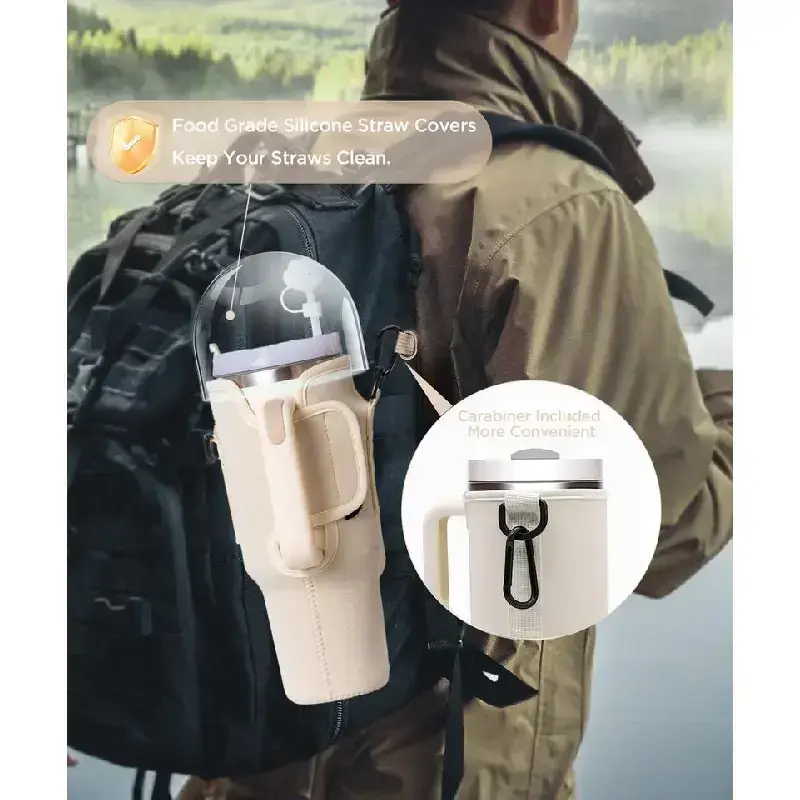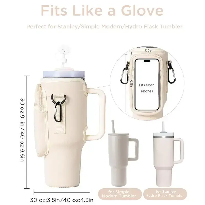 Water Bottle Carrier Bag with Phone Pocket for Stanley 40 oz Tumbler, Neoprene Water Bottle Holder Pouch with Adjustable Strap Bollus with Straw Cover & Carabiner Christmas Gift