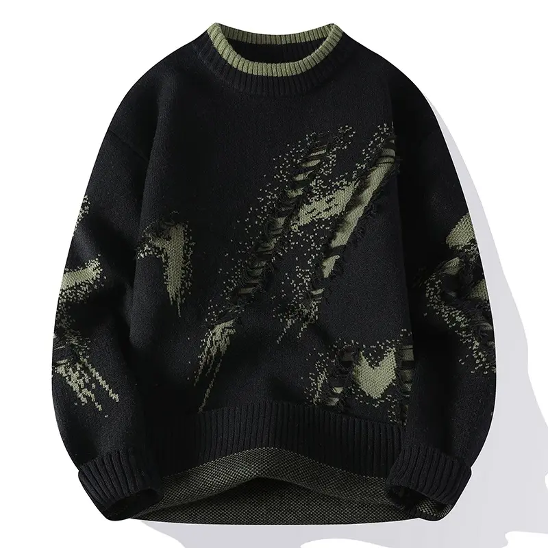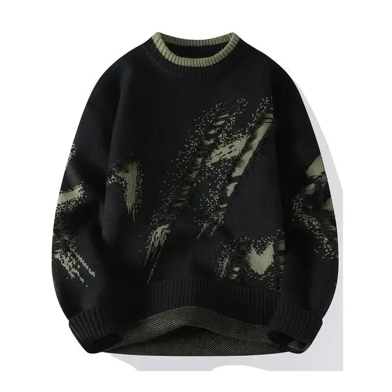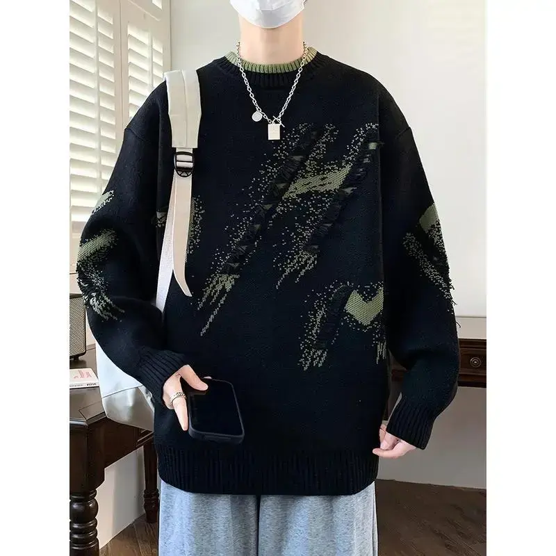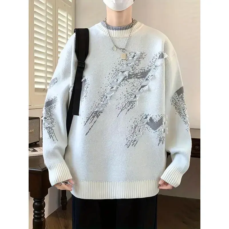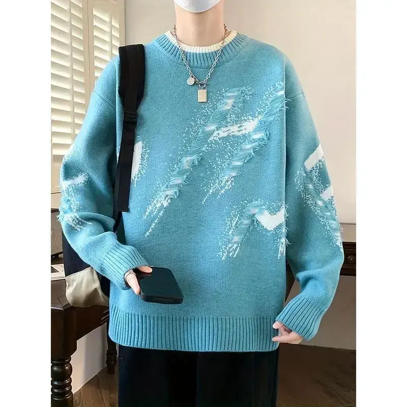 Cozy Men's Pullover Sweater ✨ Elevate your wardrobe with this loose fit, color block frayed knitted pullover sweater. Perfect for fall and winter, it offers a soft, casual feel. The long sleeve design and crew neck make it versatile and easy to match. Available in Sky Blue, White, and Black, this sweater is a must-have for any wardrobe. Stay warm and stylish with this versatile piece.