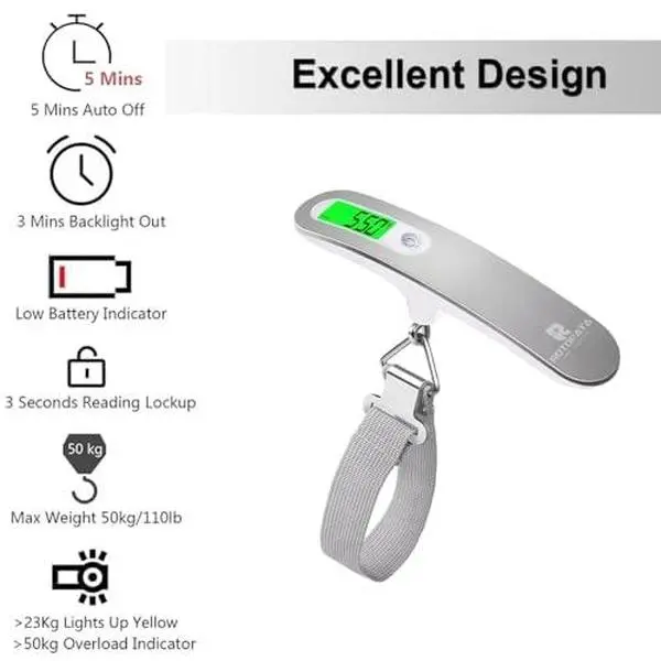 Overweight Function - When the weighing item is over 50.7lb(23kg), LCD display lights up yellow. If the item weight is over 50kg, the LCD display will show (o-ld) to warn of overload. Multi-functional - Auto off low reminder for saving power and change in time. Weight overload and auto lock weight. Included CR 2032 . Backlit LCD Display - Easy to read even in dim light for viewing. Mini size for daily pocket carry or travel.(Note: If the product cannot be turned on, please try replacing the before using it.) 4 Units Switchable and Tare Function- Maximum capacity up to 50kg, min 100g. 4 switchable weighing units : lb, kg, oz, g. Design - Made of 304 stainless steel, comfortable handle fits human palm. Keep 90 degrees vertical when weighing.