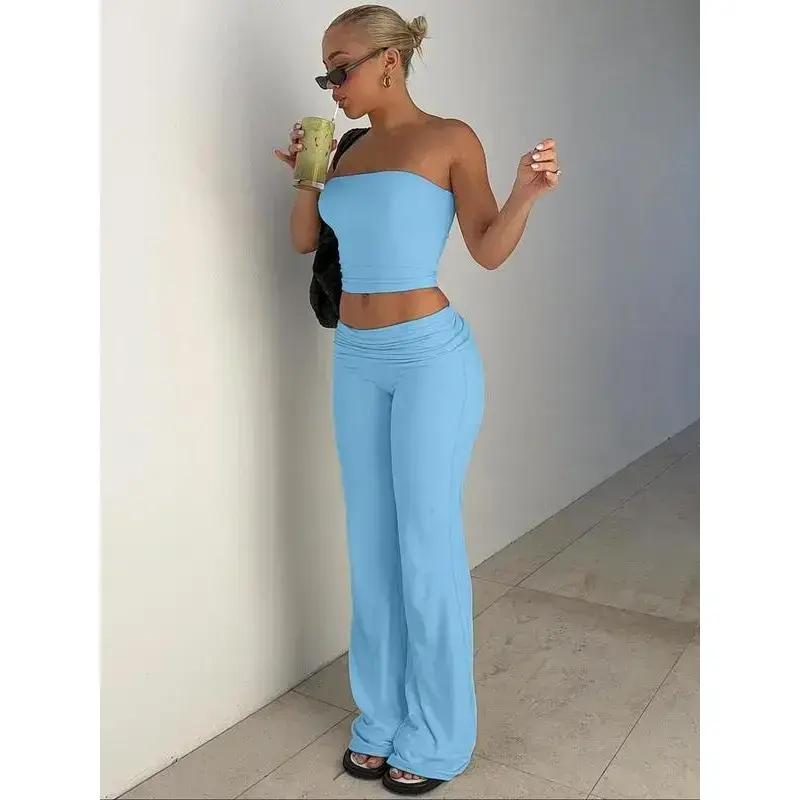 【Unique Two-Piece】: This two-piece set includes a crop tube top and high-waisted flare pants for a coordinated look. 【Strapless Cut】: The strapless neckline highlights shoulders beautifully, making it a flirty choice for the summer season. 【Drop Waist Pants】: Featuring a drop waist design, these pants offer a trendy silhouette that complements various body types. 【High Stretch Fabric】: Crafted from high-stretch material, this outfit ensures a snug fit while allowing freedom of movement. 【Easy Care】: Machine washable for your convenience, this set is perfect for hassle-free maintenance and everyday wear.