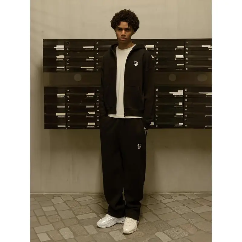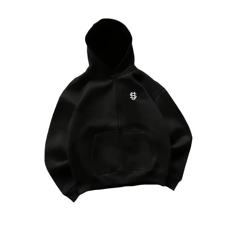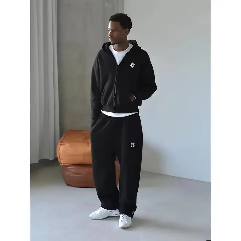Men's Y2K Oversized Full-Zip Hooded Jacket with Embroidered Logo & Geometric Pattern - Black Streetwear Coat, All-Season Outerwear, Casual to Formal Outfits