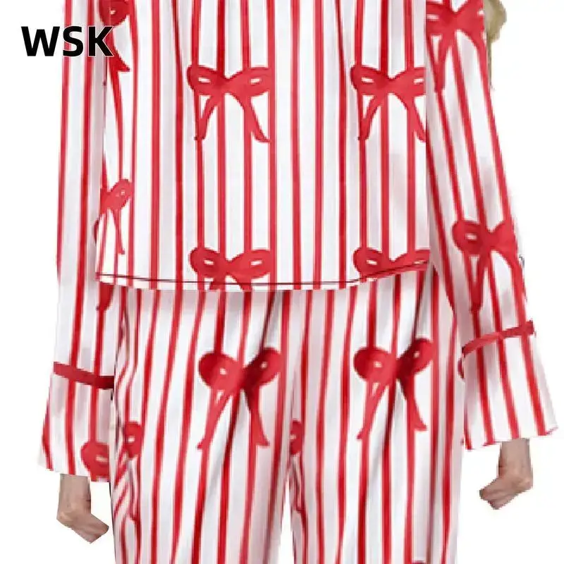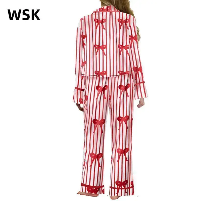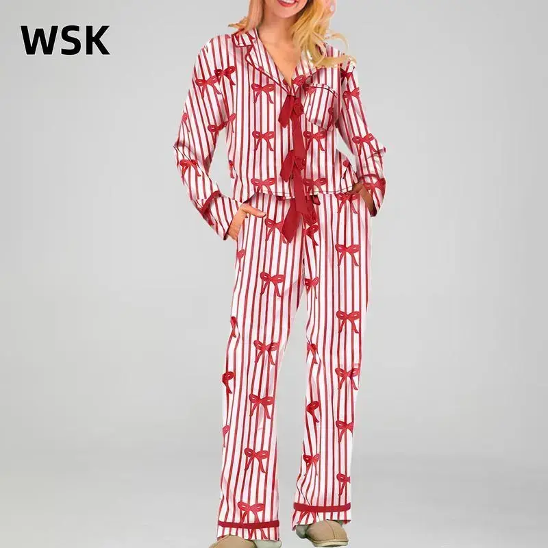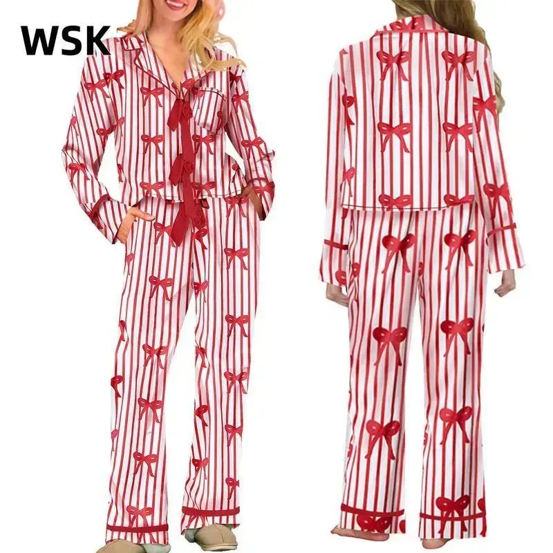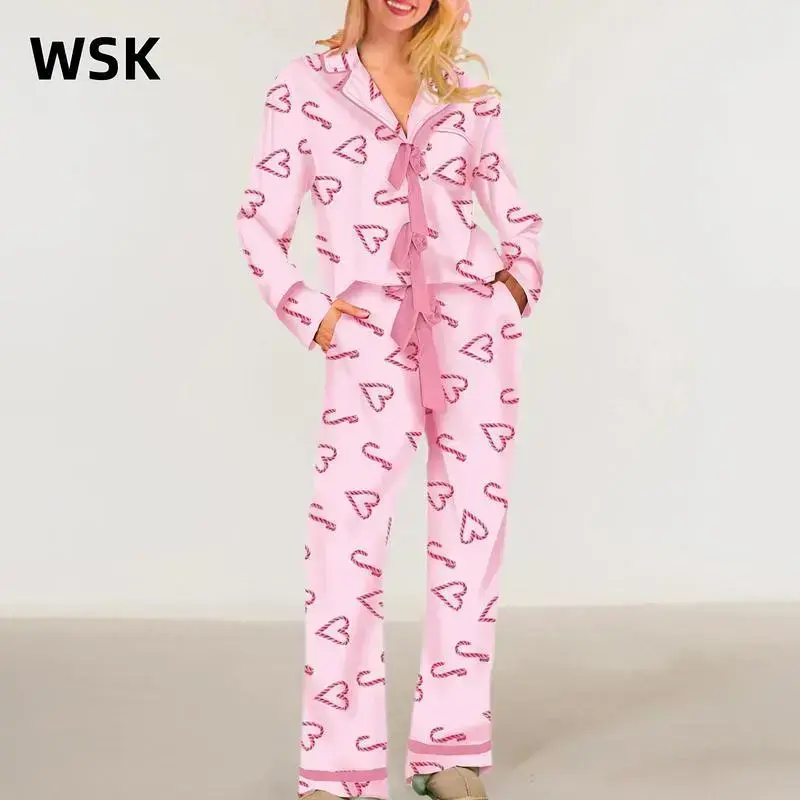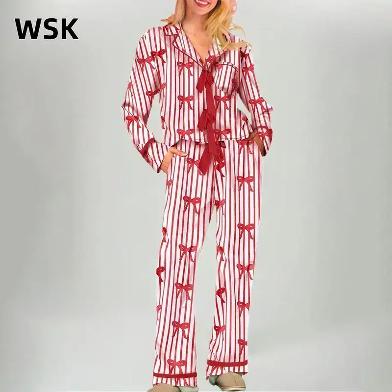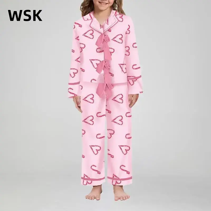 Mommy and Me Matching Pajamas Bow/Heart Print Tie Front Long Sleeve Tops and Long Pants Set Family Matching Sleepwear??gift??