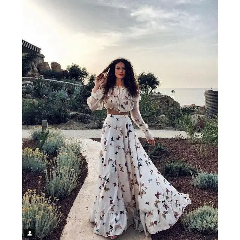 European and American Cross-Border Internet Celebrity Butterfly Print Two-Piece Bohemian Large Hem Long Skirt Beach Dress Summer White