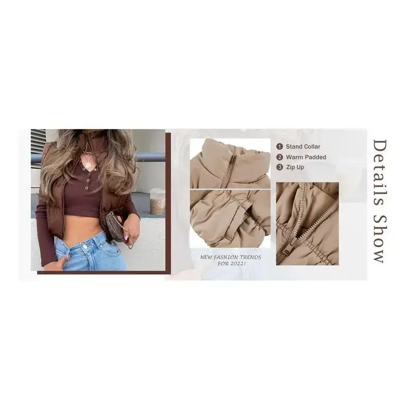 ??Women's Crop Puffer Vest Stay warm this winter with our Women's Crop Puffer Vest!This zip-up, sleeveless design is perfect for layering.The padded coat offers lightweight warmth, ideal for chilly days.It's a versatile outerwear piece that pairs effortlessly with your favorite outfits.Elevate your wardrobe with this essential top. ??Key Features Zip-Up Closure: Easy on and off. Sleeveless Design: Ideal for layering. Lightweight Material: Padded for warmth without bulk. Padded Coat: Provides extra insulation. Womenswear Tops: Stylish and functional. ???Perfect for Everyday Wear This crop puffer vest is a must-have for your winter collection. Its design ensures both coort and style. Whether you're heading out for a walk or running errands, this vest keeps you cozy. Complete your look with this practical and fashionable piece.