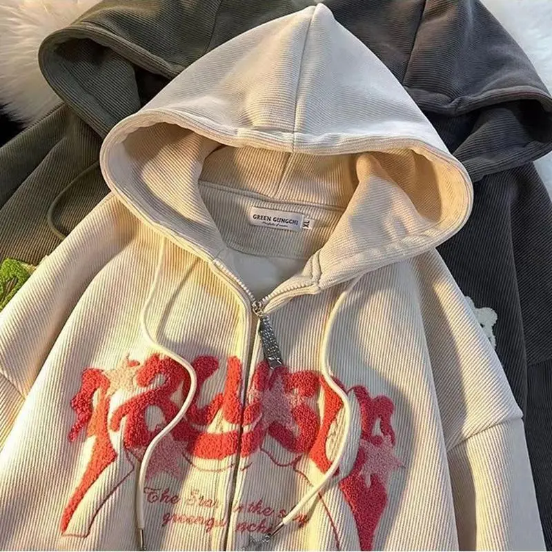 Fashion Embroidery Zip Up Hoodies Women Autumn Long Sleeve Tops Loose Hood Shirt Harajuku Y2K Clothes Female Sweatshirt Jacket