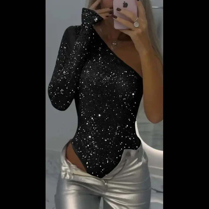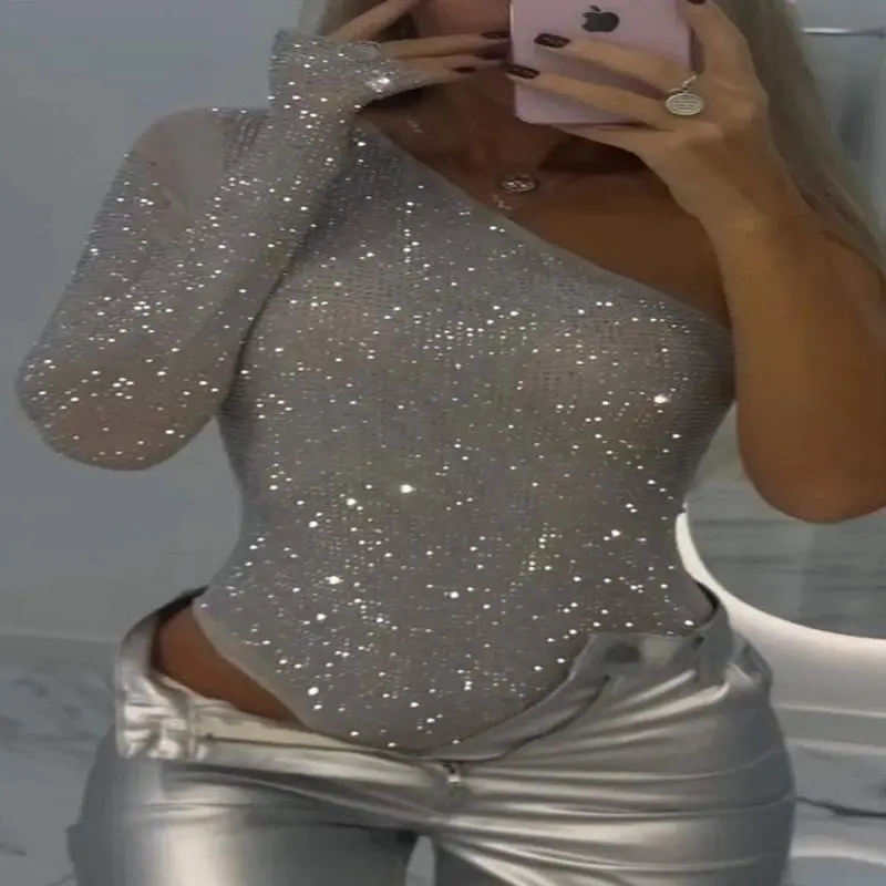 Sparkling Rhinestone One - Shoulder Bodysuit Perfect For Party Nights, Club Outfits & Glam Photos, Shine Bright Like A Star bodysuits women shapewear bodysuit Fabric Polyester Womenswear Solid Style Tops