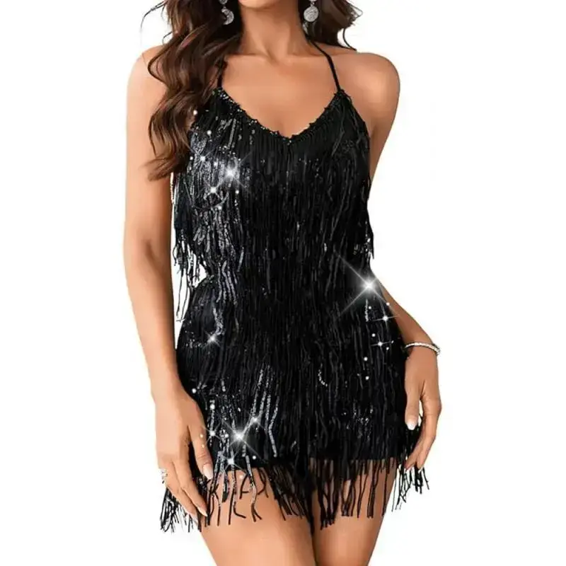 Women's Sequin Fringe Sparkly Glitter Metallic Backless Bodycon Black Romper Jumpsuit for Disco Birthday Dance Outfit