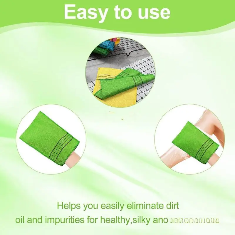 🌟Korean Exfoliating Mitt Glove Set🌟 ✨Get 12 pieces of Korean-style exfoliating bath cloths in various bright colors!Choose from small sizes in yellow, green, blue, and pink.Perfect for long-term use or sharing with family and friends.The assortment ensures you always have a fresh, colorful option. Soft & Durable Material 🧼Crafted from quality viscose rayon, these cloths are soft and gentle on your skin.They won't scratch or damage your body.With good texture and durability, they're flexible and long-lasting.You'll enjoy using them for a long time without breaking or fading. 🧼Ideal for both men and women, teens and adults.Use it for face washing or bathing.It effectively removes dead skin, leaving your skin clean and smooth.Simply rinse with warm water, soak the towel, and gently scrub your body. Easy Care & Portability 🧼Hand washable and hang to dry.Its compact size and lightweight make it easy to store or carry.Perfect for trips or home use.Hang it on the wall or place it on a bathroom table without taking up much space. 🧼Apply to clean face and body skin at home, in beauty salons, spas, and bathhouses. It serves as a cleanser and exfoliator, removing dirt, makeup, and dead skin cells. Enjoy convenience in everyday cleaning.