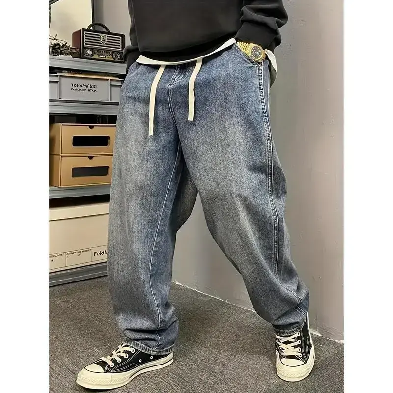 1pc Vintage Washed Distressed Cargo Jeans for Men, Loose Fit Harem Pants with American Style Micro Flare, Elastic Drawstring, Casual Dad Pants, All-Season Comfort, Casual Wear Jeans|Vintage Distressed Jeans|Woven Fabric Jeans, PLUS SIZE