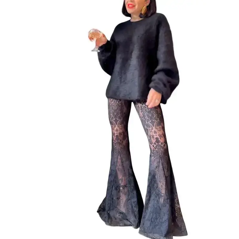2026 Spring Fall Lace Two Piece Set Women Long Sleeve Loose Fit Suit Y2K Elegant Casual Daily Outfit Matching Set Comfortable Chic Dress Bohemian Bottom Fashion Womenswear High Neck Drop Shoulder Sweater Set